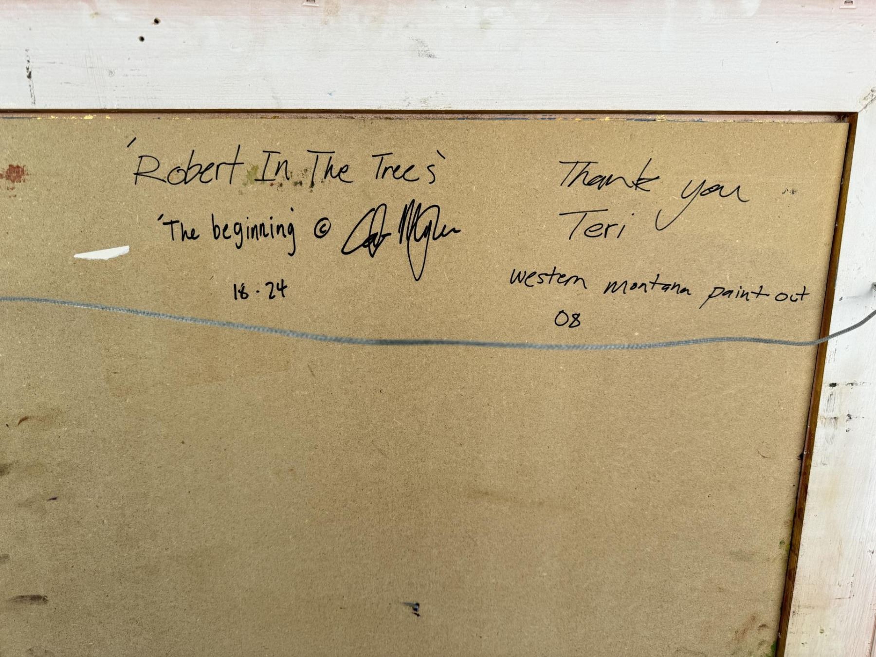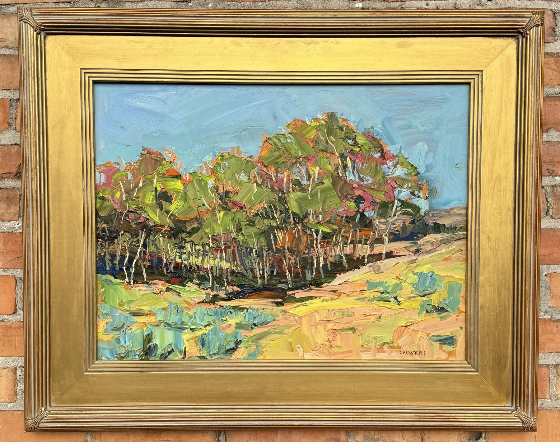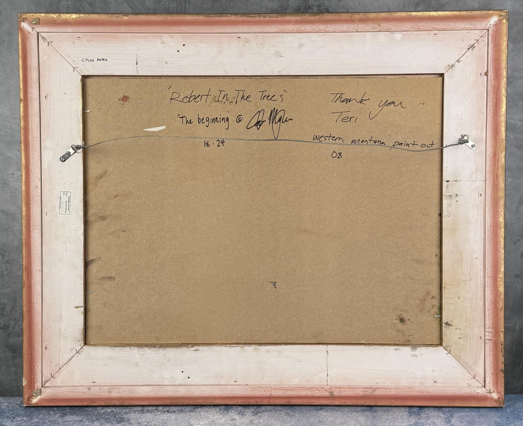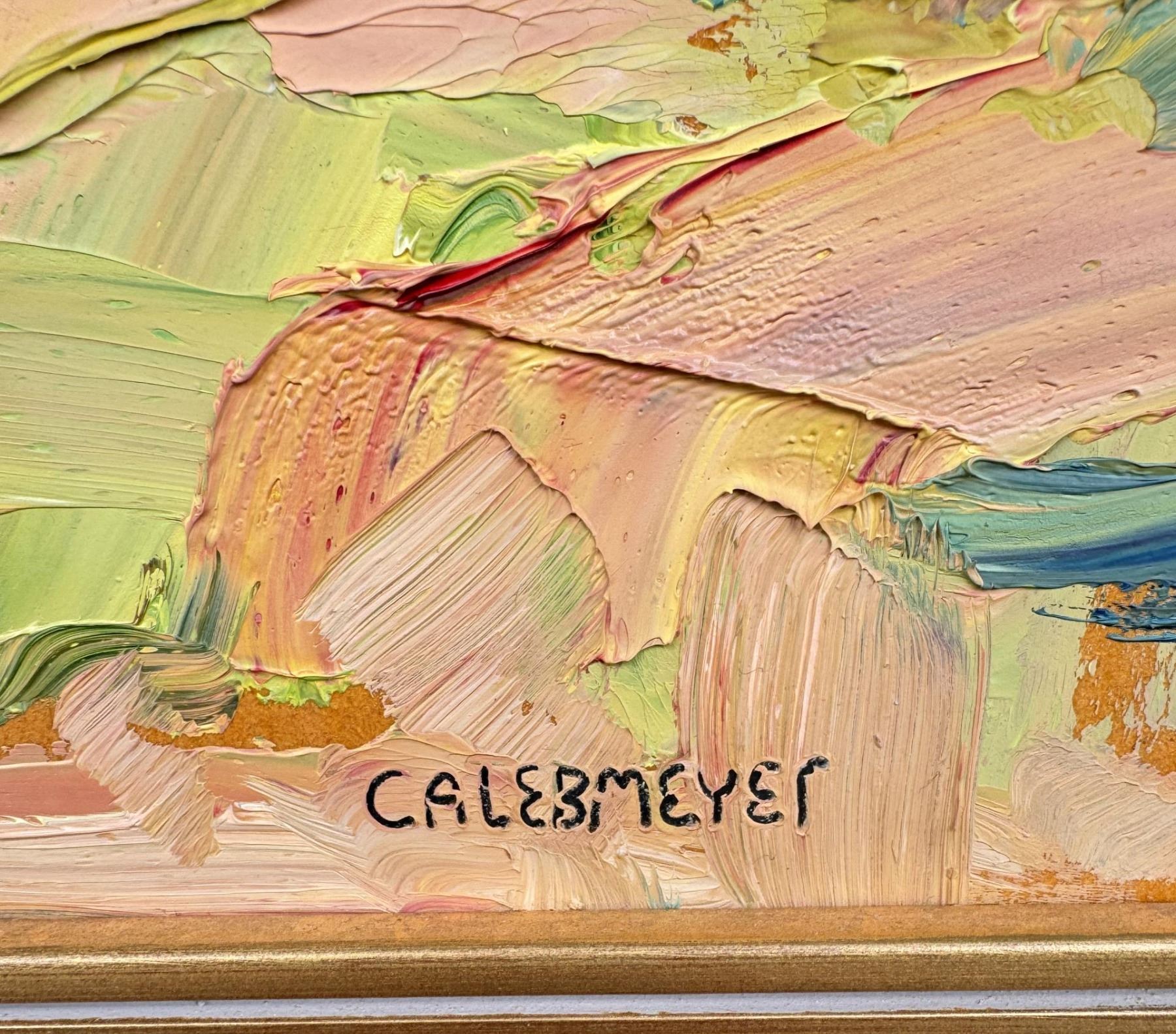 Title is Robert in the Trees. 18" by 24" unframed. 26 1/2" by 32 1/2" framed. Caleb Meyer (Born 1982) is active/lives in Idaho. Caleb Meyer is known for Landscape, Botanical. Caleb Meyer was born and raised in Idaho. He spent many summers in the Sawtooth Mountains of central Idaho where he realized the splendor of creation, and nurtured the desire to create. As a senior in high school Caleb, was named art student of the year. He went on to receive a Bachelor of Arts degree in art education from Boise State University. After graduating in 2007, Caleb and his wife, and baby boy, moved to Burley, Idaho to work and study with artist Robert Moore. Since then Caleb and his wife have had a baby girl, and jumped 'head first' into the world of fine art. Focusing on what he perceives as exciting movement and shapes of the palette knife technique, Caleb has developed a personal style that to him feels fresh and vibrant.