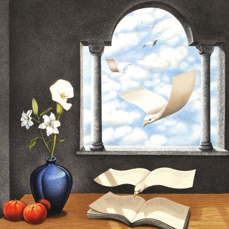 "Calendar of Yesterday's Wishes" is a limited edition lithograph on museum quality deckle-edge paper, numbered and hand signed by Rafal Olbinski. Includes Certificate of Authenticity! Measures approx. 26" x 27.5" (with border), 22" x 22.5" (image).