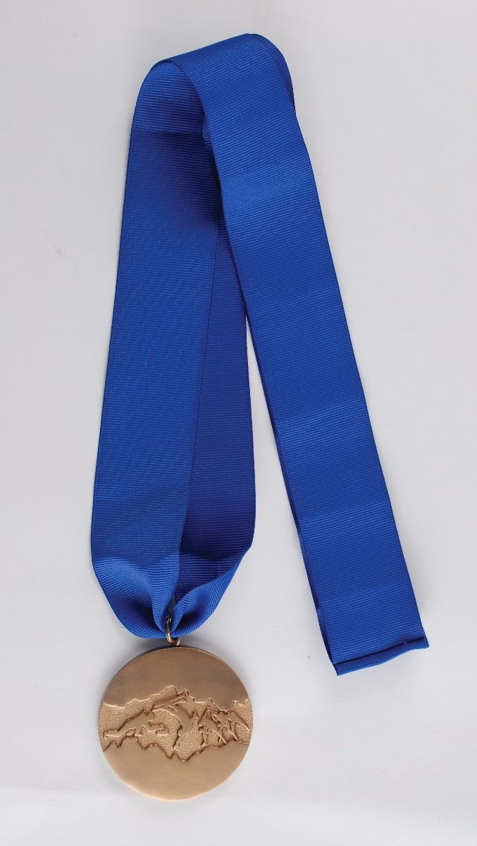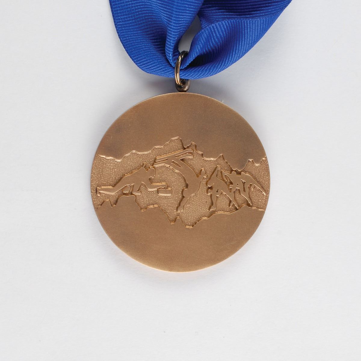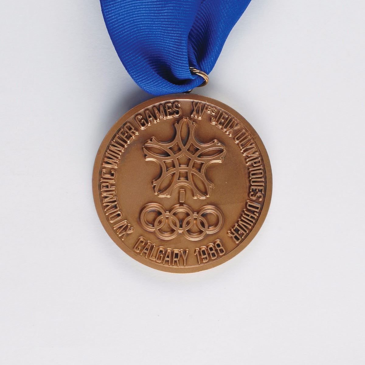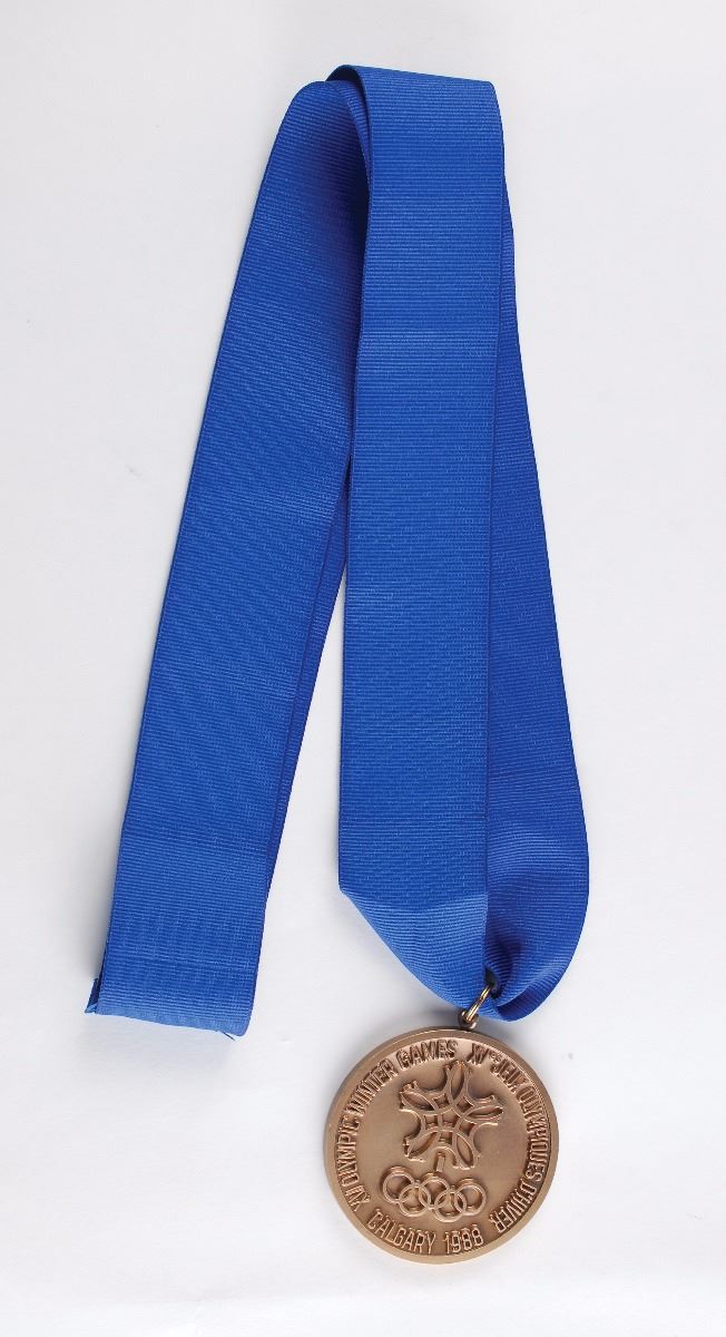 Unusual unawarded winner’s medal issued for demonstration sports in the 1988 Calgary Winter Olympics. Bronze, 64 mm, 155 gm, by Cornelius Martens. The front depicts the Calgary Games emblem encircled by raised French and English text, “XV Olympic Winter Games, Xves Jeux Olympiques D’Hiver, Calgary 1988”; the reverse depicts the three demonstration events of the Games: curling, freestyle skiing, and short track speed skating. The medal is suspended from a blue replacement ribbon. A desirable example of an uncommon medal.
