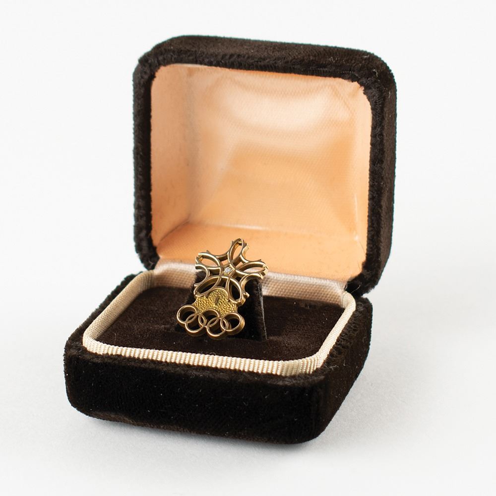 Desirable pairing of IOC items from the Calgary 1988 Winter Olympics: an uncommon badge featuring the emblem of the Calgary '88 Winter Games in a silver-on-black design, 32 mm x 45 mm with white ribbon below, on its black cord; and a 10K gold pin by Jostens, 15 mm x 22 mm, featuring a small diamond inset into the snowflake emblem with the Olympic rings below.