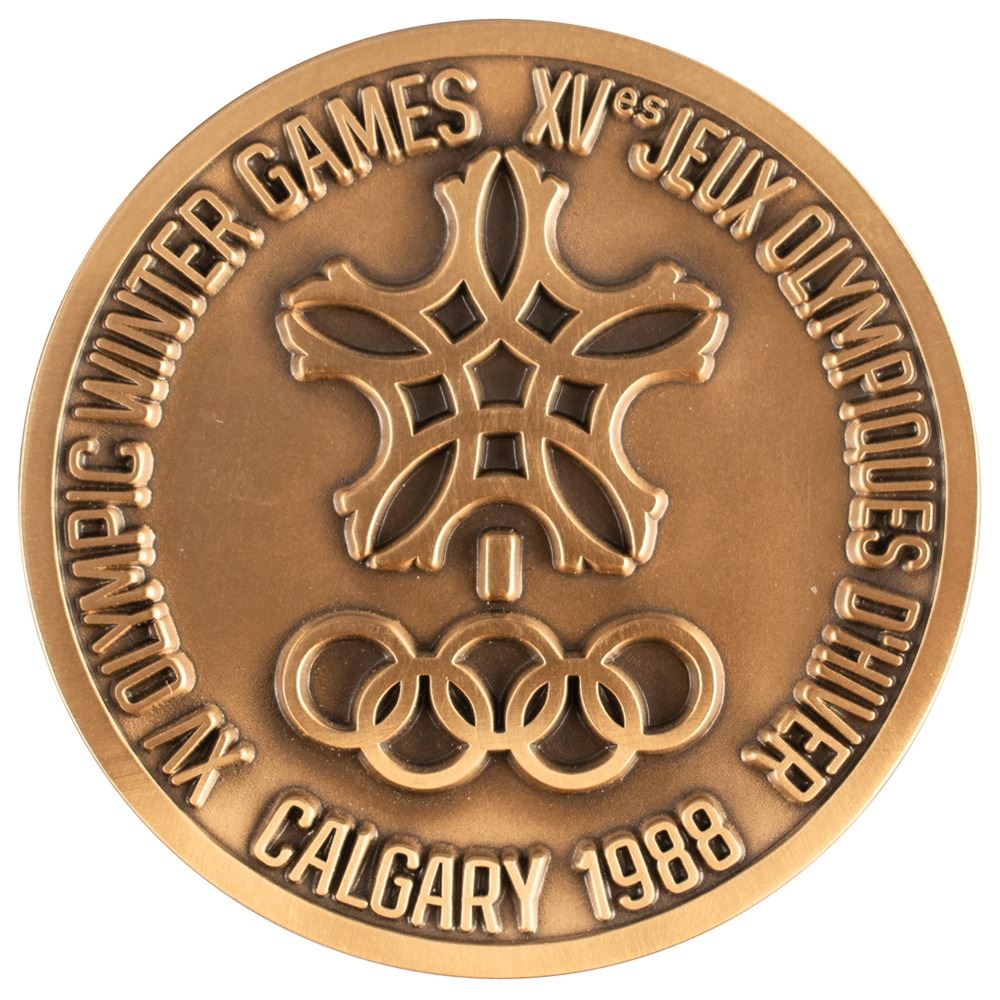 Participation medal issued for the Calgary 1988 Winter Olympics and presented to Paula Andrews, the mayor of the Olympic Village and a member of the Calgary Winter Olympic Organizing Committee (OCO ’88) Board of Directors. Bronze, 64 mm, 133 gm, by Cornelius Martens. The front depicts the Calgary Games emblem and raised French and English text, “Calgary 1988, XV Olympic Winter Gamesâ€; the reverse bears a panoramic view of Calgary, the Saddledome Stadium, and the Canadian Rocky Mountains, with the Olympic motto below. Includes its original velvet case.
