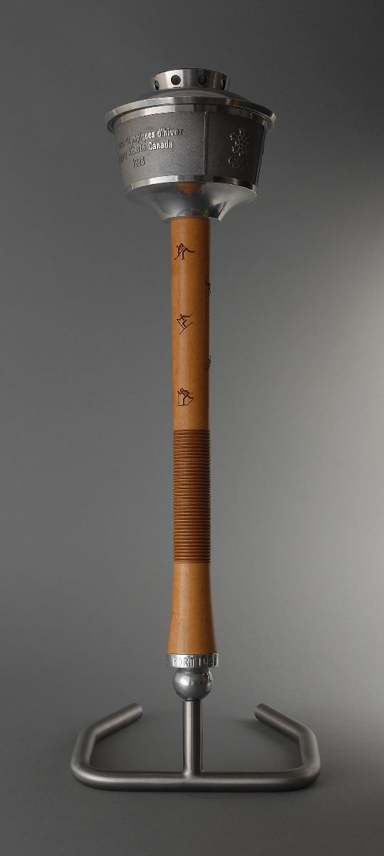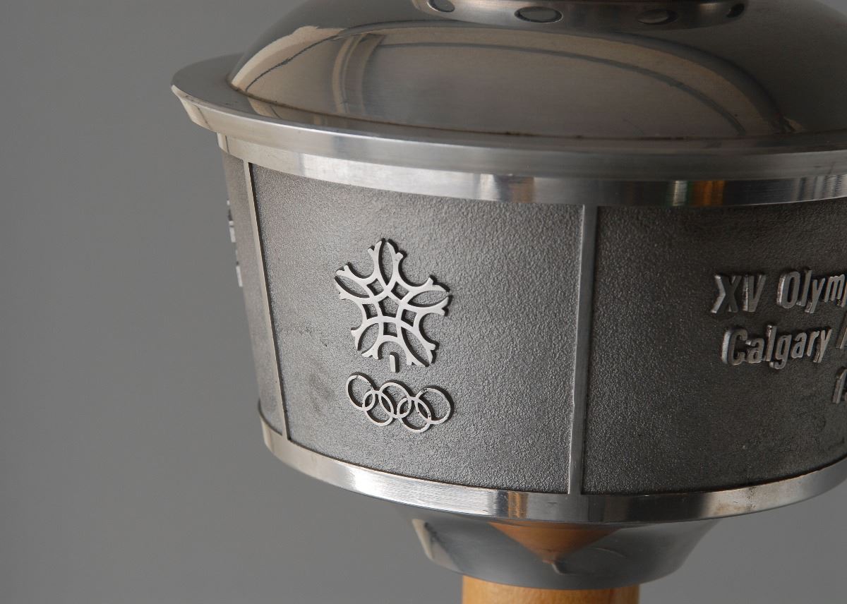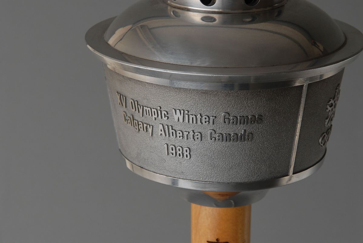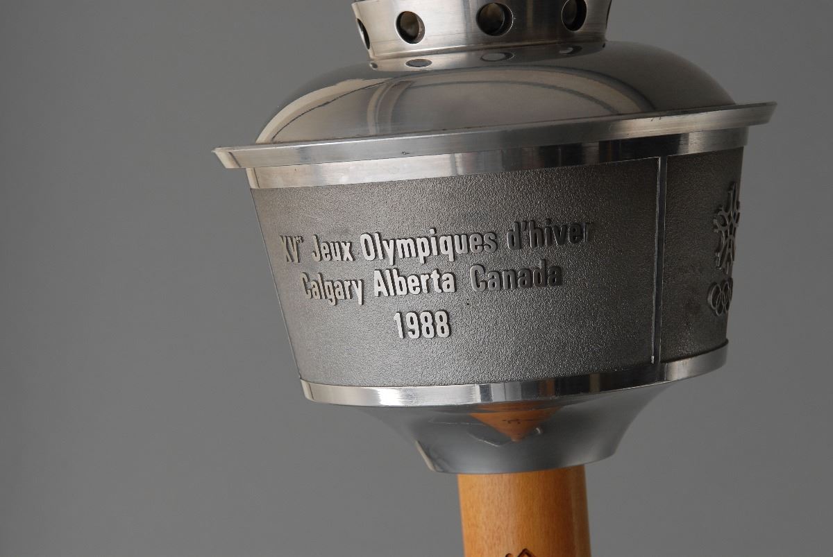 Exceptionally rare official 1988 Calgary Olympics torch, comprised of aluminum with a maple handle, measuring 23.5? in length, emblazoned on the handle with pictograms of ten Winter Olympic sports. The top is inscribed, “XV Olympic Winter Games Calgary Alberta Canada 1988,” and the ball at the bottom is engraved with the Olympic motto, “Citius, Altius, Fortius.” This example is unused and retains its four original wicks above a canister. Also includes its original black carrying bag and stand, as well as one of the few miner’s lamps, manufactured by Koehler, that was used during the torch relay to carry the “Mother Flame.” The Mother Flame was originally lit at the Panathenaic Stadium in Athens during the hand-over ceremony from the Greek leg of the torch relay to the Calgary Organizing Committee. The flame in this miner’s lamp was used to transport and potentially re-light the flame during the cross-Canada relay, if the flame ever went out on one of the torches. A mere handful of Olympic Mother Flame Carriers exist from the relay and the only other confirmed example is housed in a Calgary gallery.