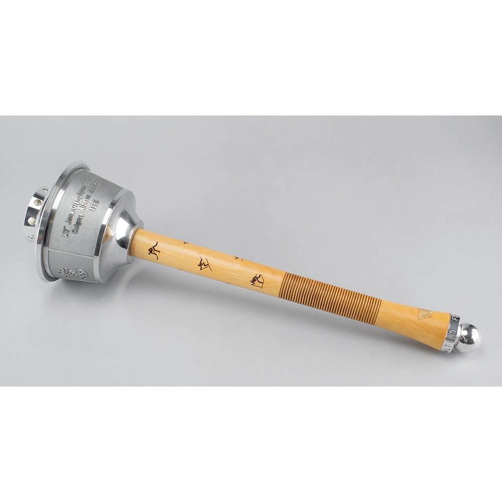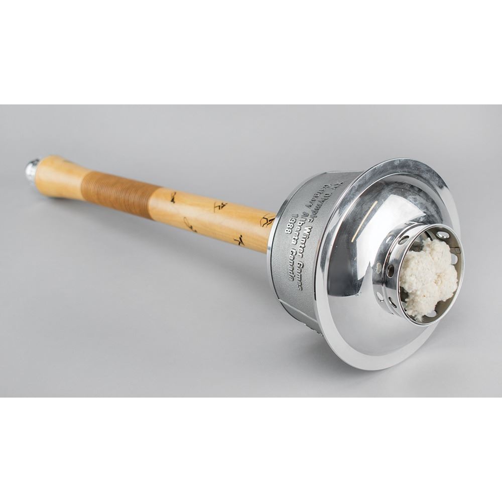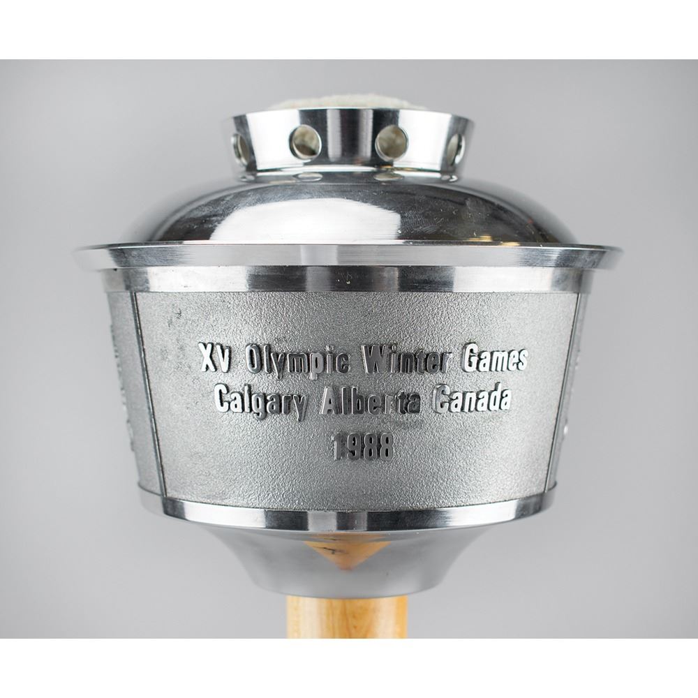 Very desirable official 1988 Calgary Winter Olympics torch used during the Olympic relay, comprised of aluminum with a maple handle, measuring 23.5″ in length, emblazoned on the handle with pictograms of ten Winter Olympic sports; tape to lower portion of handle marked "157." The top inscribed with raised text in English and French, "XV Olympic Winter Games Calgary Alberta Canada 1988," with underside of bowl engraved: "COA/A.O.C. 1979-1986"; the ball at the base of the handle is engraved with the Olympic motto, "Citius, Altius, Fortius." Complete with its unlit wick.