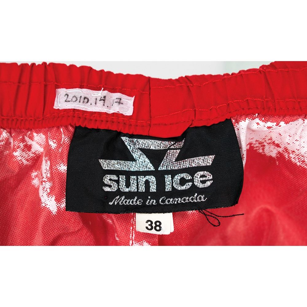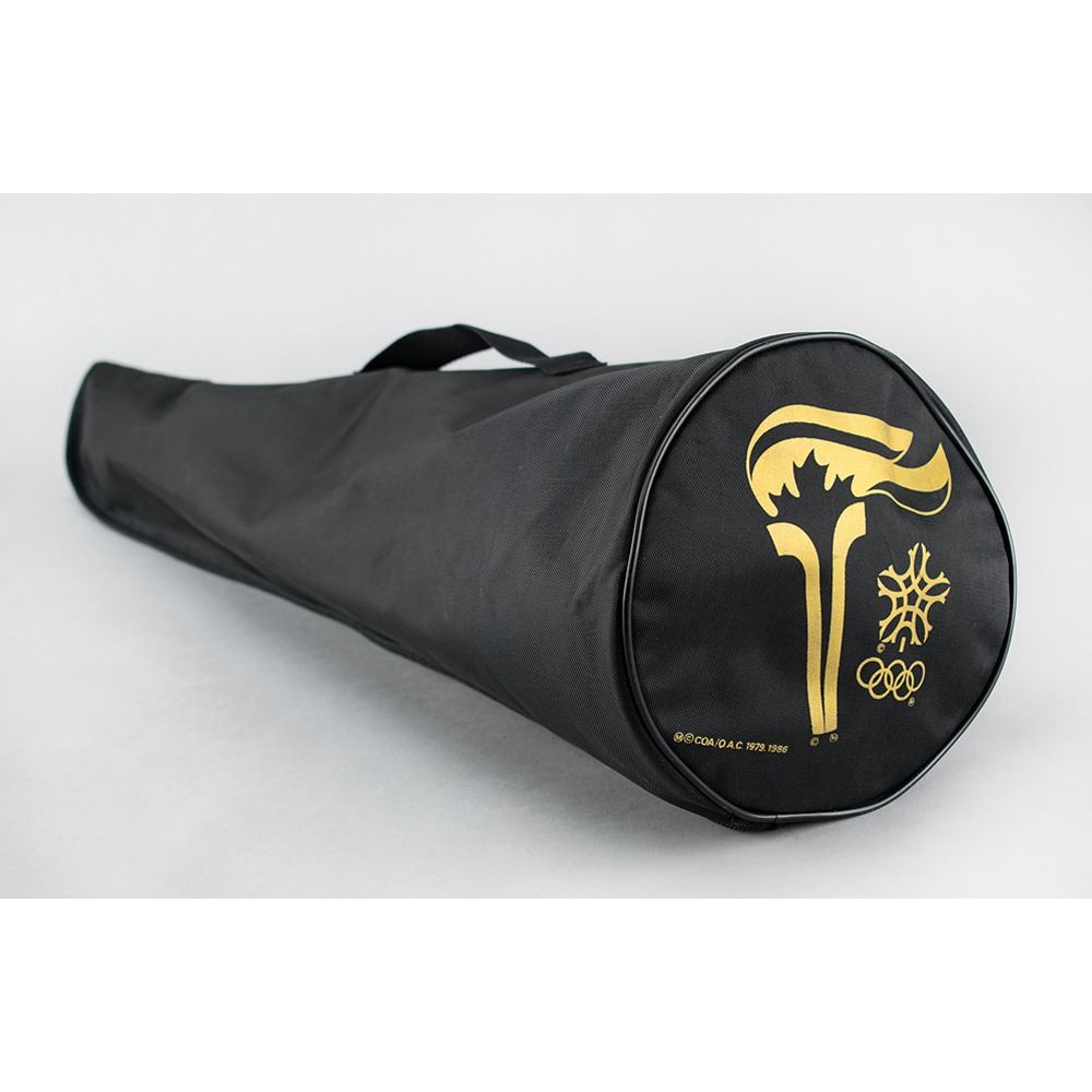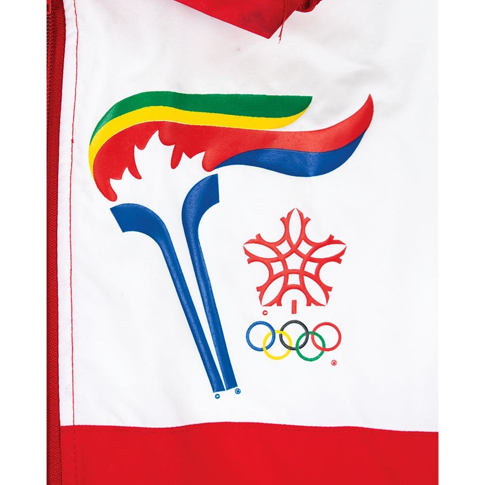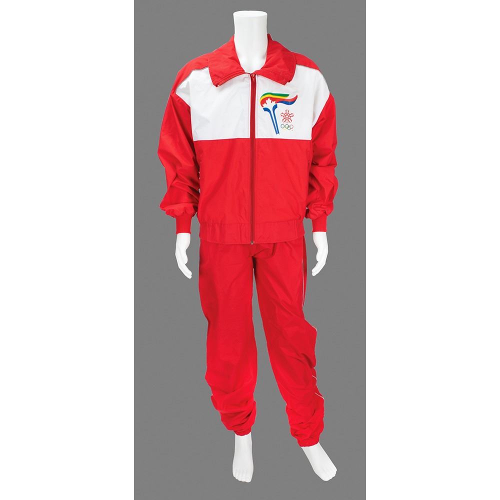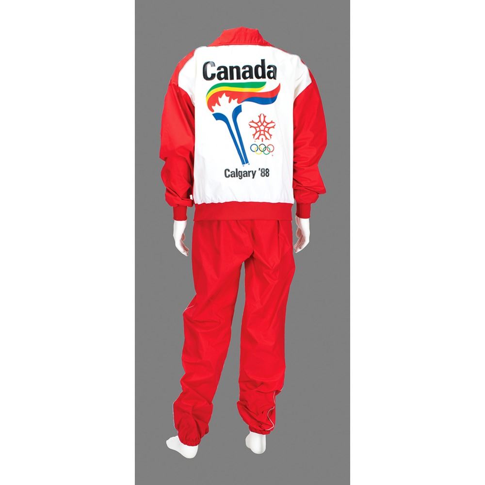 Includes the original black carrying bag and a highly appealing official torchbearer relay suit of the Calgary Games by Sun Ice of Canada, which consists of red and white zip-up jacket, size large, with brightly colored Calgary and torch relay logos to left chest and back area, and a pair of red track pants, size 38, with elastic waistband; custom labels to inner collar and waist area are marked "2010.14.16" and "2010.14/.17."