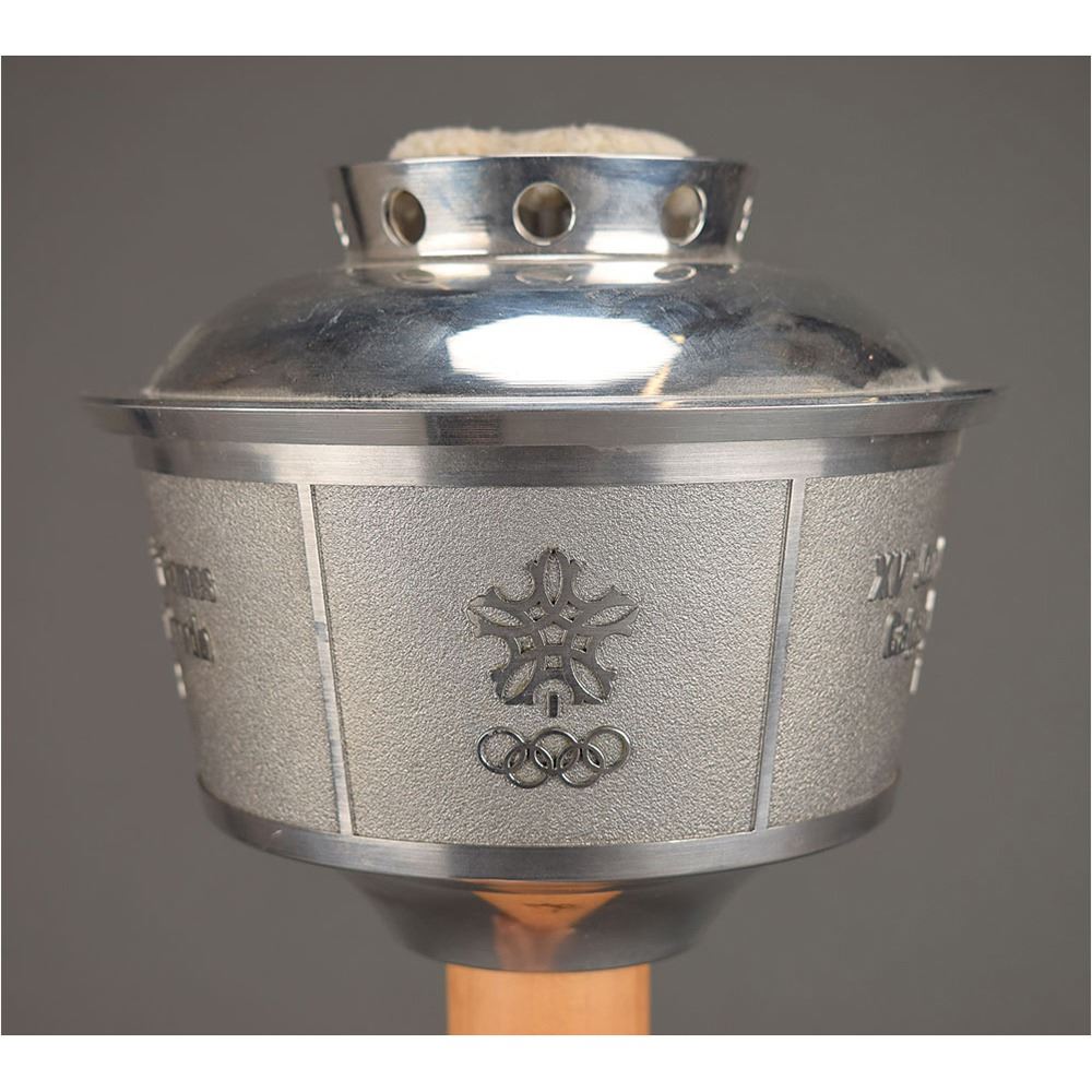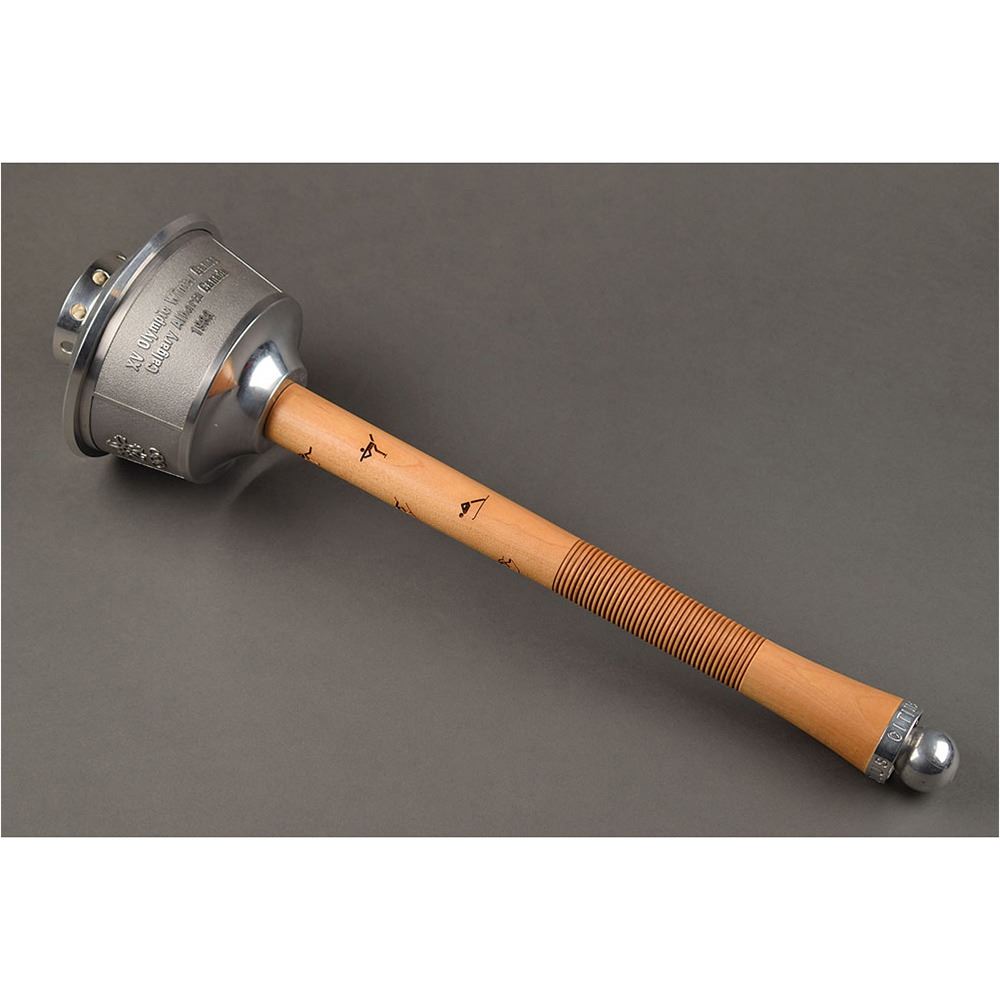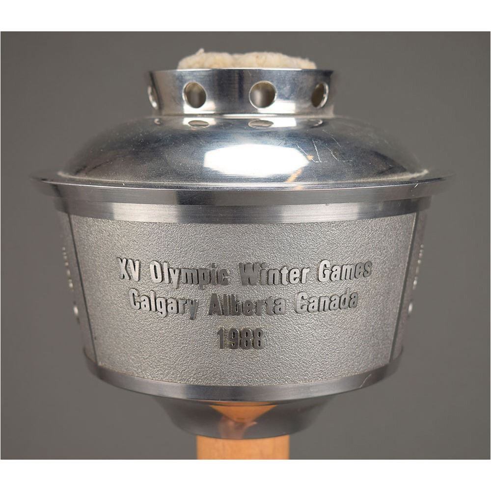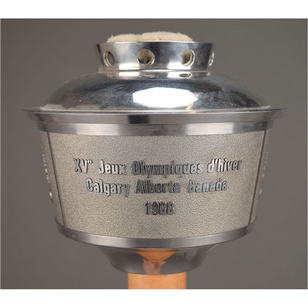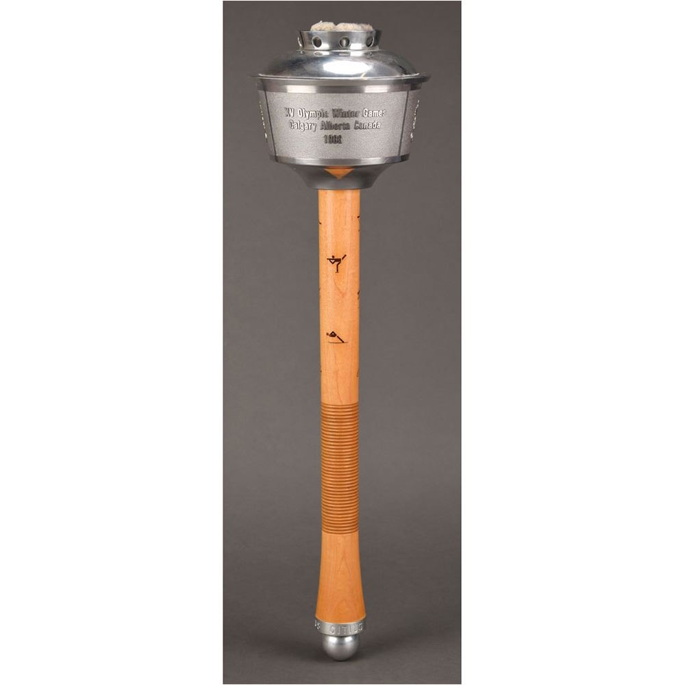 Rare official 1988 Calgary Winter Olympics torch used during the Olympic relay, comprised of aluminum with a maple handle, measuring 23.5? in length, emblazoned on the handle with pictograms of ten Winter Olympic sports. The top inscribed with raised text in English and French, “XV Olympic Winter Games Calgary Alberta Canada 1988,” with underside of bowl engraved: “COA/A.O.C. 1979–1986”; the ball at the base of the handle is engraved with the Olympic motto, “Citius, Altius, Fortius.”
