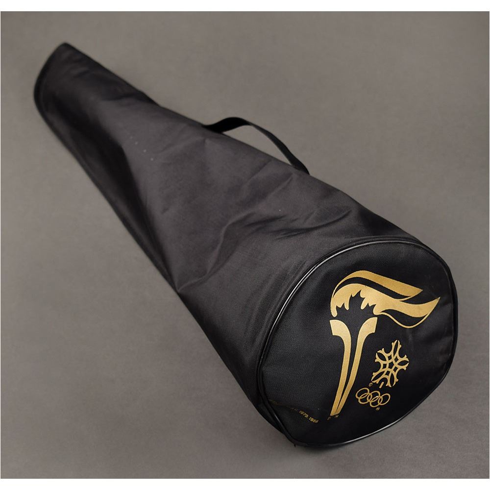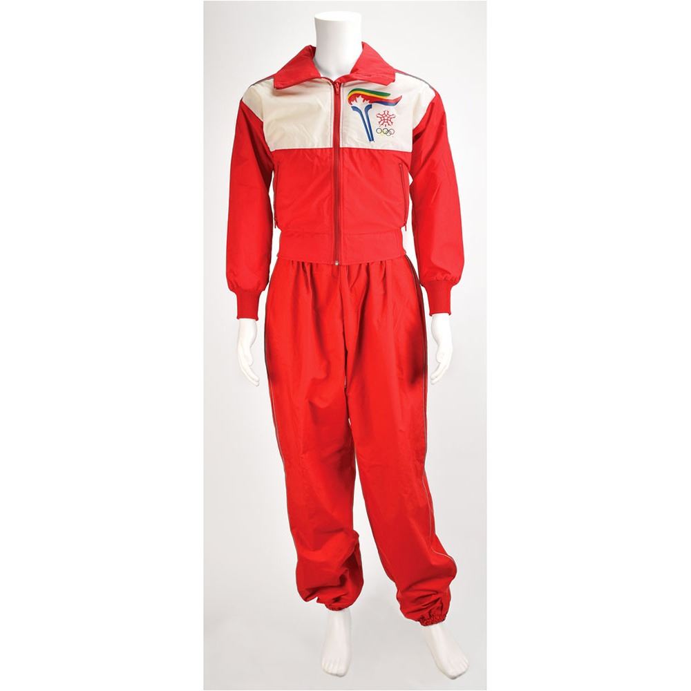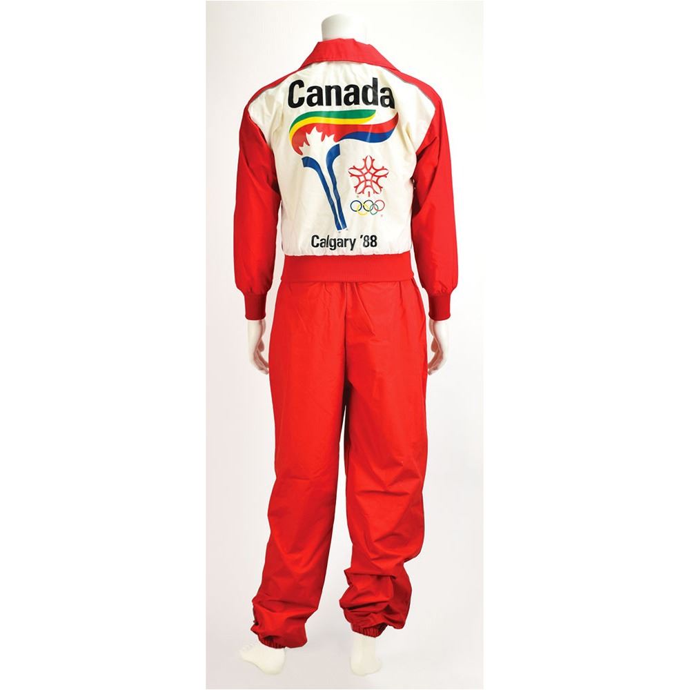 Includes an unused four-wick burner canister, the original black carrying bag, and a highly appealing official torchbearer track suit of the Calgary Games by Sun Ice of Canada, which consists of red and white zip-up jacket, size eight, with brightly colored Calgary and torch relay logos to left chest and back area, and a pair of red track pants, size 18, with elastic waistband.