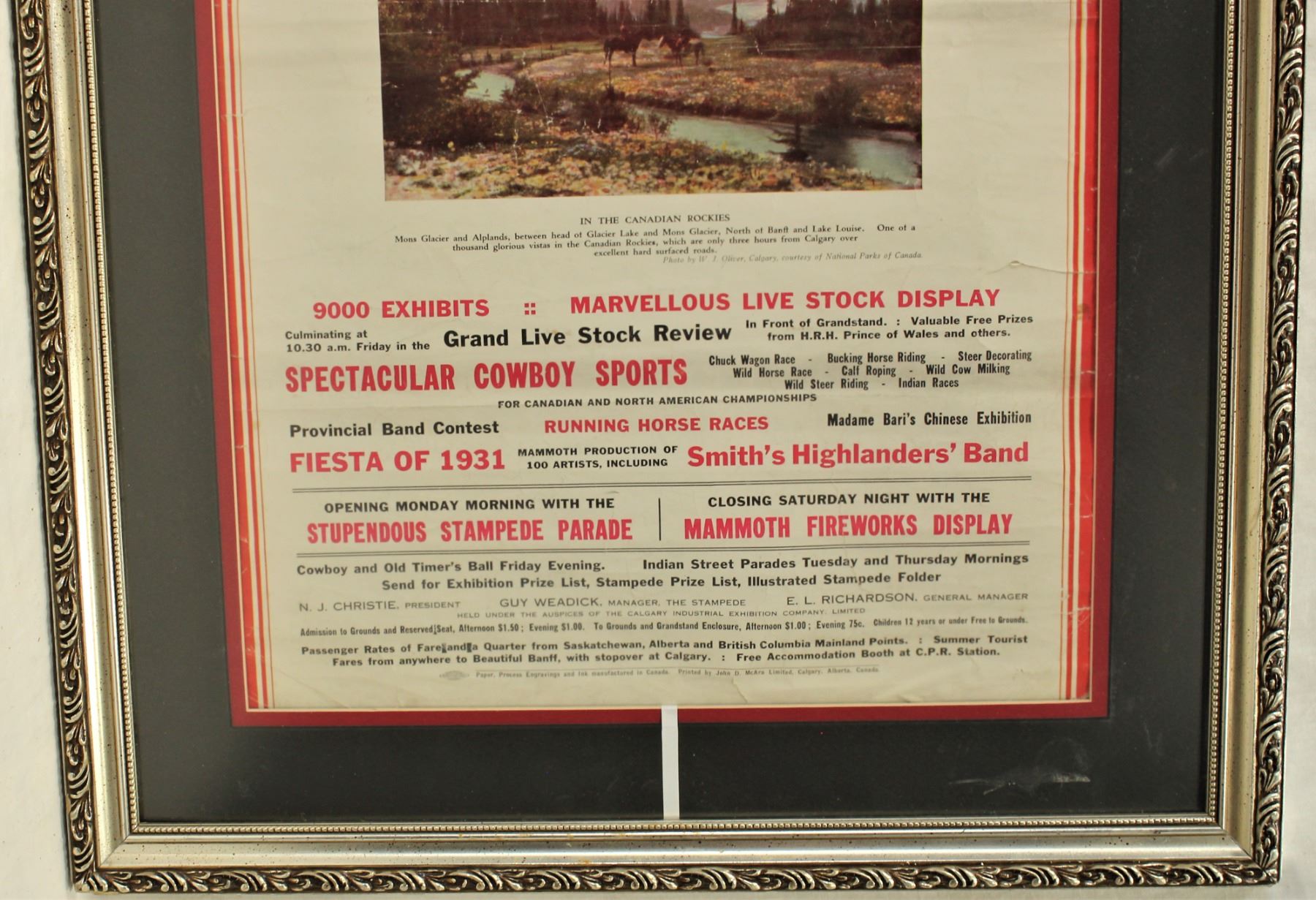 Colorful 1931 Calgary Stampede poster with great graphics and pictorial appeal. Framed and matted, overall measurement 19"x 45".