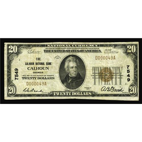 <B>Calhoun, GA</B></I> - $20 1929 Ty. 1 <B>The Calhoun NB</B></I> Ch. # 7549<BR>Nicely matched to the type 2 $20 from here offered below. <B>Fine-Very Fine.</B></I>