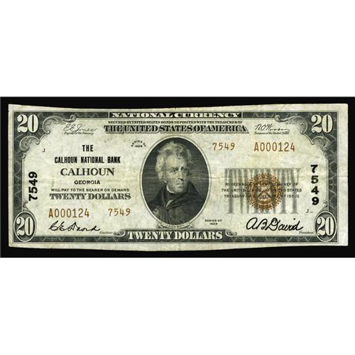 <B>Calhoun, GA</B></I> - $20 1929 Ty. 2 <B>The Calhoun NB</B></I> Ch. # 7549<BR>This <B>Very Fine</B></I> retains much original paper body and remains the sole $20 1929 type 2 documented from here.