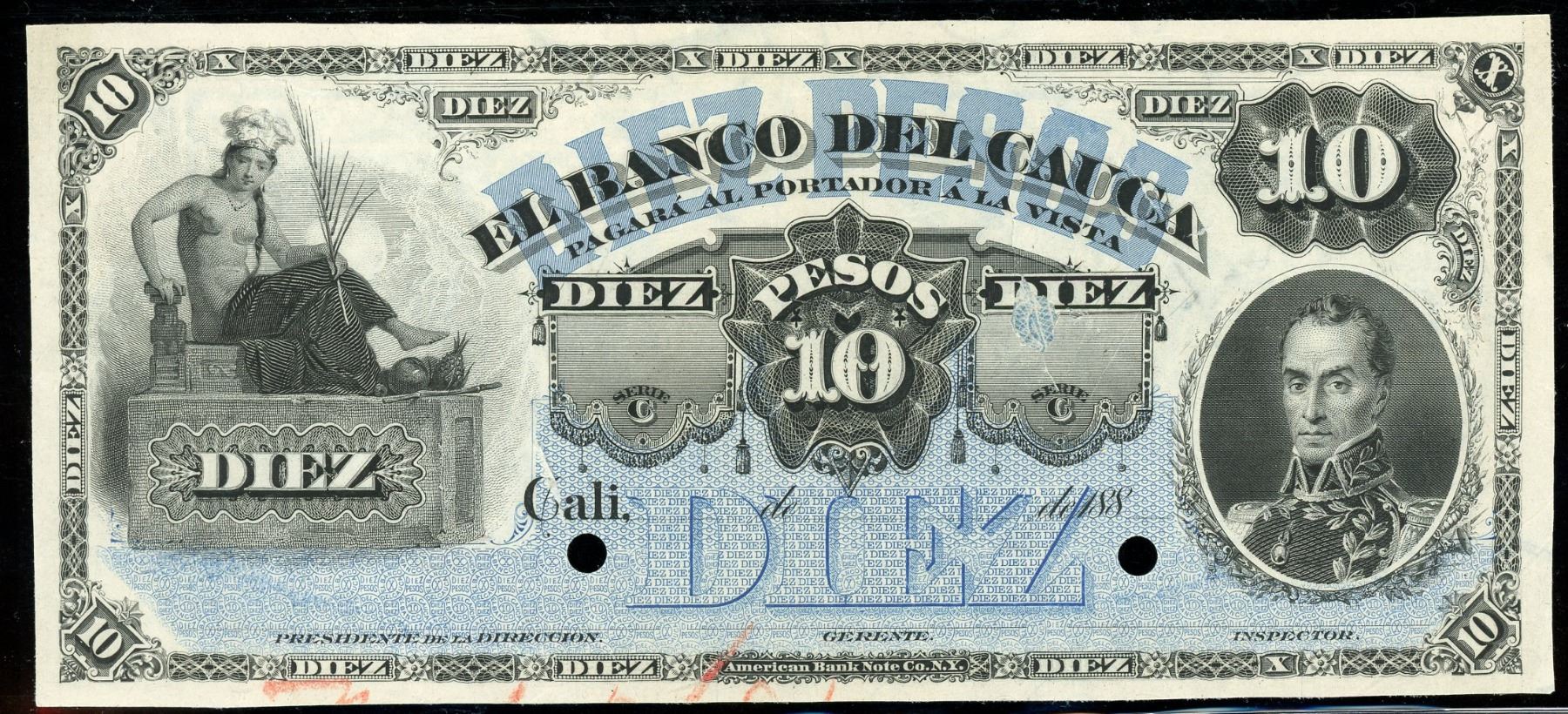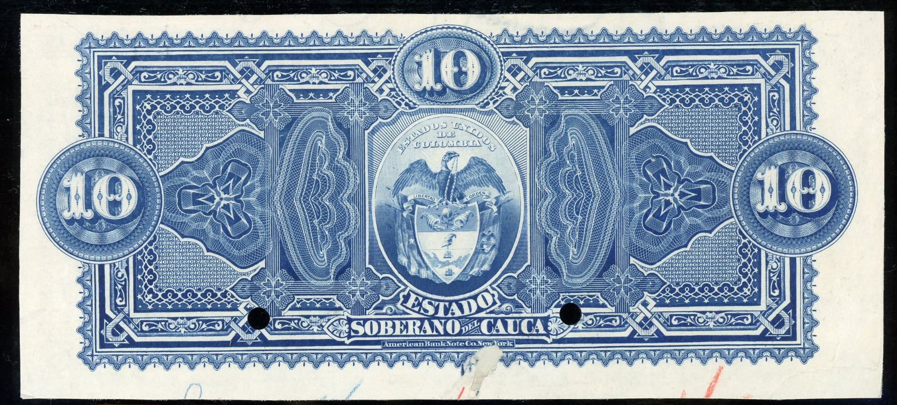 Cali, Colombia, Banco del Cauca, 10 pesos front and back proofs, no date (1881). SCWPM-S360p1, S360p2; CHPM-7837. Pleasing blue ink colors on both sides of this ABNCo-produced private bank note. About Uncirculated front and back proofs, pasted together with minor tears from prior demounting and a printer's annotation along the bottom.