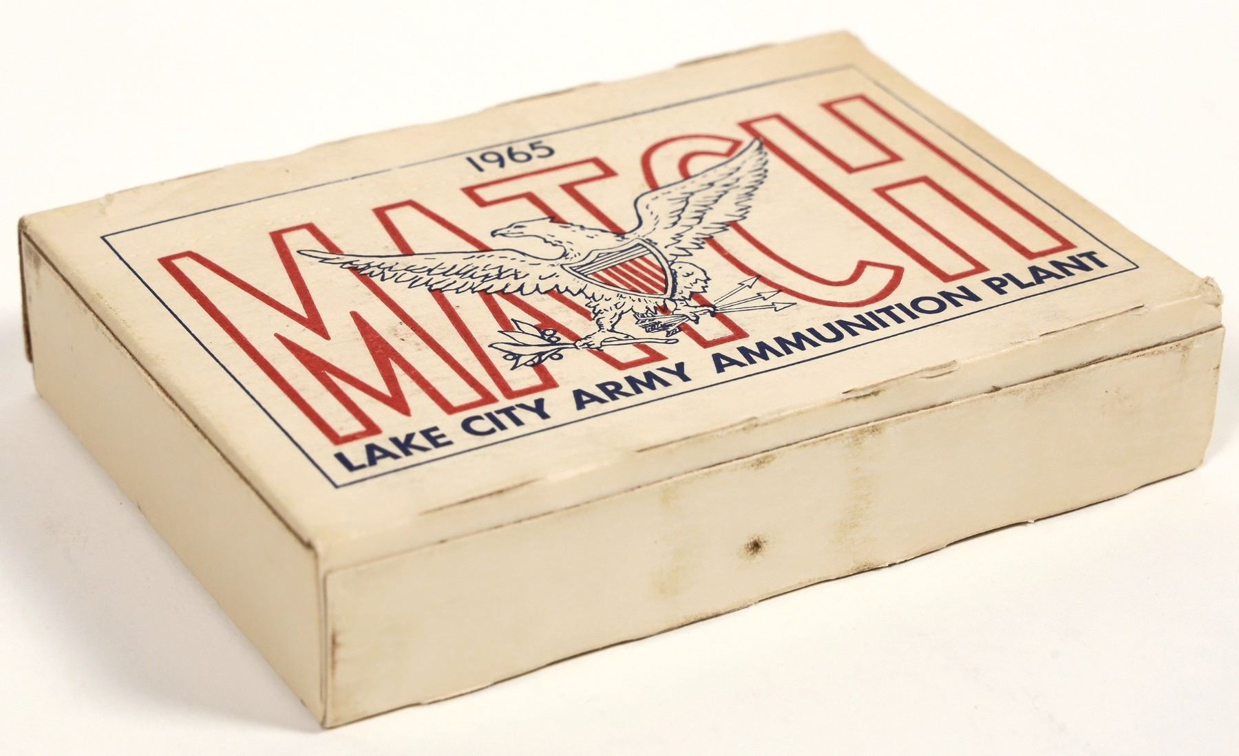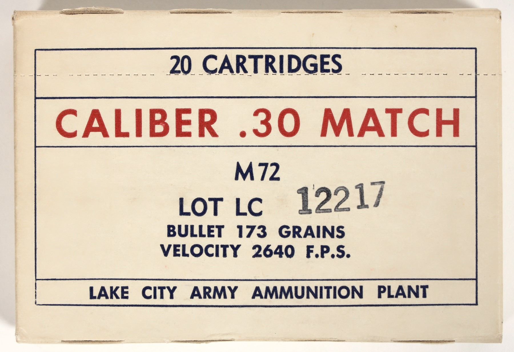This is a complete box of 20 rounds "Caliber .30 Match" ammunition from "Lake City Army Ammunition Plant" (Salt Lake City). The back of the box is marked "1965/Match/ Lake City Army Ammunition Plant". "M72/ Lot LC 12217/ bullet 173 grains/ velocity 2640 F.P.S." The box is sealed and unopened. This box of ammunition is unique because it was made for competition shooting at Camp Peery, Ohio for the best shooters the US Army can produce. Each round would require hand loading and weight matching. Excellent condition. No sales to Connecticut, California, New Jersey, New York, Illinois, Hawaii, and Massachusetts. No international sales. Extra shipping charges apply. Please see photos for details.