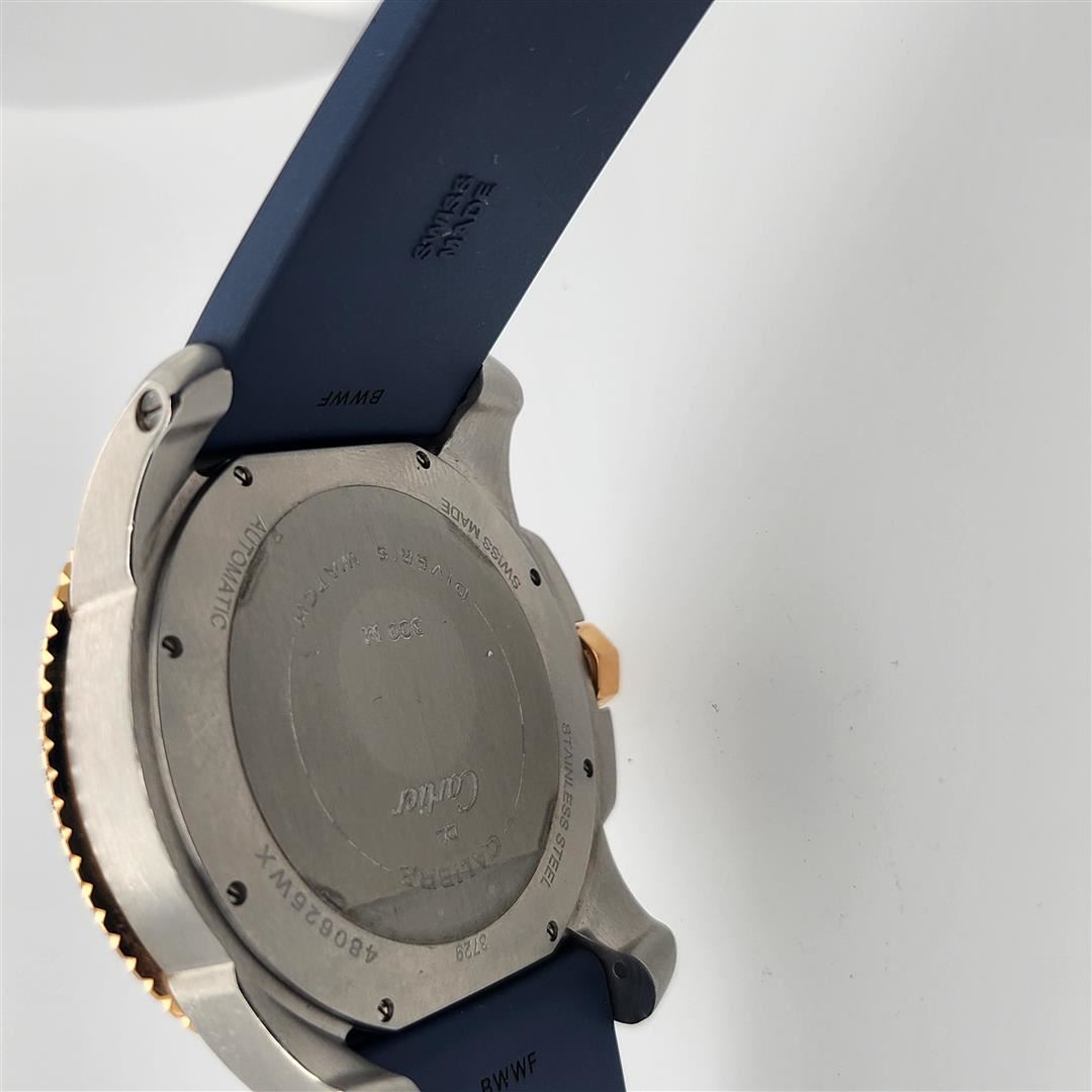 One Calibre de Cartier Swiss Made Automatic Wristwatch. - Swiss Made - Blue Dial - Roman Numeral Hour Markers - Blue Ceramic Bezel with Super-LumiNova Markers - Faceted Steel Crown Set with a Synthetic Spinel - Sword Shaped Blued Hands - Date Feature - Small Seconds Sub-Dial at 9 O'Clock - 48 Hour Power Reserve - Self-winding Automatic Movement - Cartier Caliber 1904-PS MC - Vibrations Per Hour: 28,800