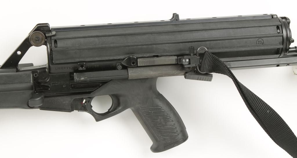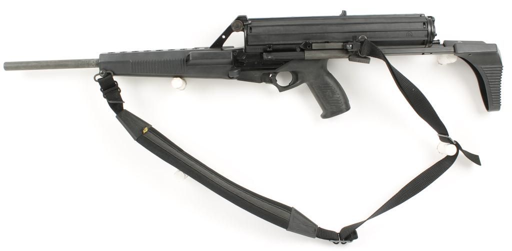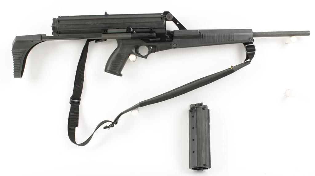 Semi auto tactical carbine with 16" barrel. Black finish, polymer pistol grip and hand guard, sliding buttstock, helical feed detachable magazine, ambidextrous safety and sling. Very good bore and action. Includes a 50 round and a 100 round magazine. Condition: Very good showing light use.