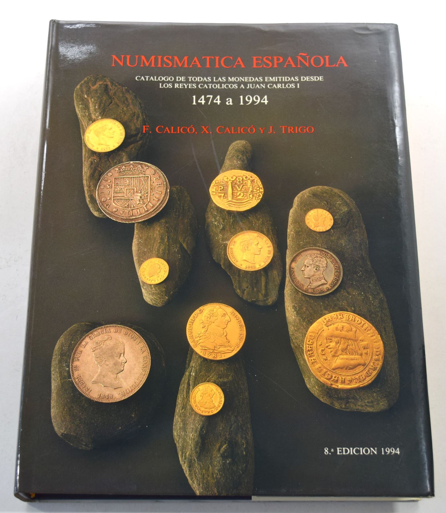 Calico, F. & X. Calico & J. Trigo. NUMISMATICA ESPAÑOLA DESDE FERNANDO E ISABEL A JUAN CARLOS I AÑOS 1474 A 1994. Gabinete Numismático Calicó. 1994. 4to, 727 pages; Hardcoverw D/J; This book is a comprehensive catalog to the gold, silver, and copper coinage of the various monarchs and mints in Spain and the New World from 1474 to 1994. Subject: Coinage - Spain