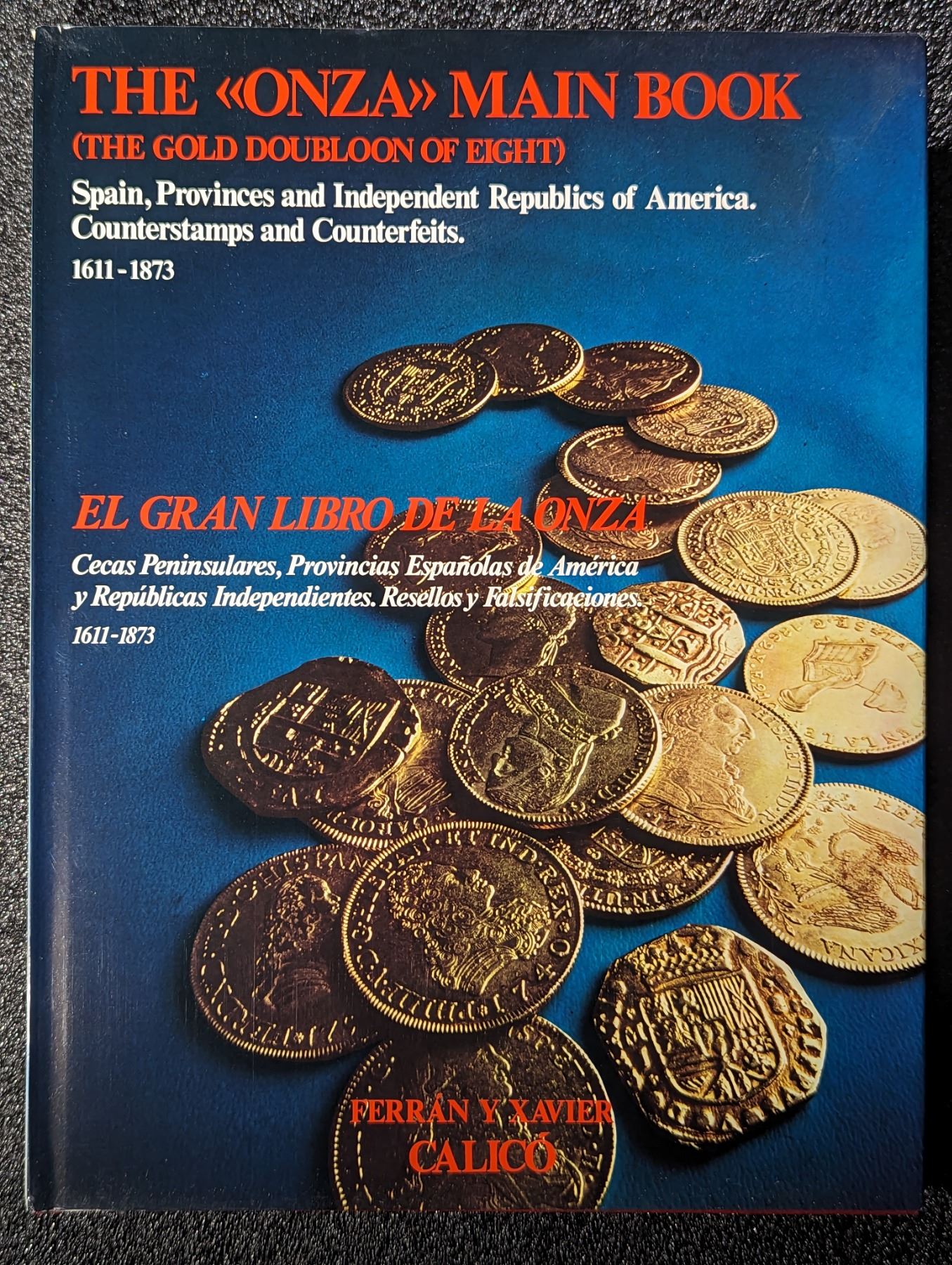 Calico, Ferran & Xavier Calico. THE «ONZA» MAIN BOOK. SPAIN, PROVINCES AND INDEPENDENT REPUBLICS OF AMERICA. COUNTERSTAMPS AND COUNTERFEITS 1611-1873. Gabinete Numismatico Calico, Barcelona. 1986. 4to. 222, (2) pages. Original red leatherette, gilt, jacket. b&w coin photos throughout. Spanish and English text. Jacket/Book Fine. This book is a catalog the gold eight escudo (or onza) coinage of the various monarchs and mints in Spain and the New World from 1611 in the Colonial period to 1873. Each coin is listed by Calico number and has information on date, assayer, mint, monarch, rarity and market value. Each coin is photographed in obverse and reverse black and white photos. Lot weight: 2 lbs 9oz. Subject(s): Spanish, Spanish American Coinage.