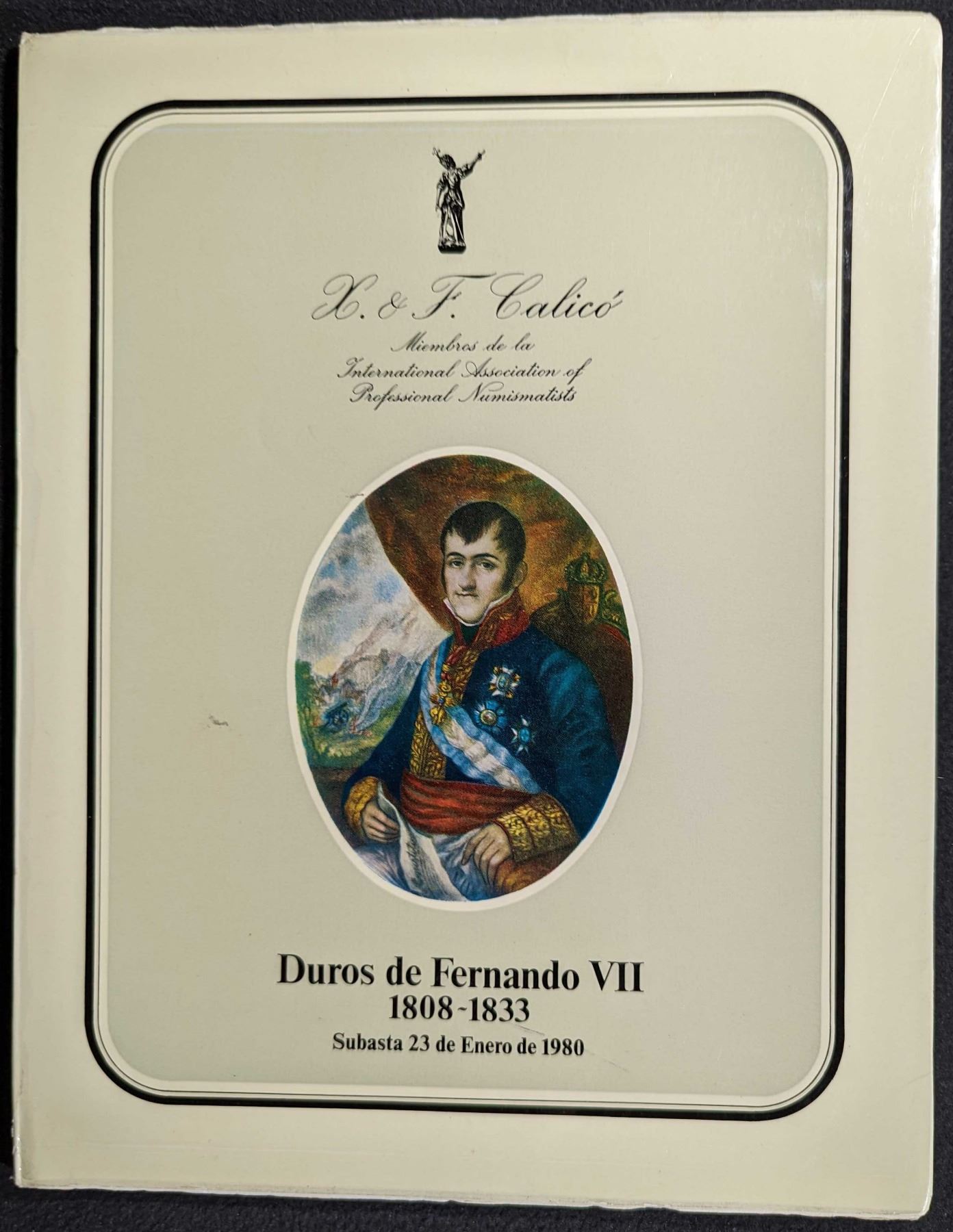 Calico, X.& F. DUROS DE FERNANDO VII 1808-1833. January 23, 1980. 1-275 Lots. 4to. This auction sale catalog includes numismatic material from Spain and the Spanish Americas. The specialty of the duros of Fernando VII to which the collection of this catalog is dedicated offers incentives in various aspects. The time of Fernando VII so moved, saw the Napoleonic Wars with the Bonapartist defeat; the birth of most of the American Nations; the influence in Spain of the doctrines of the French Revolution; the liberal and absolutist tendencies, all framed in a character so discussed and mistreated by History as Ferdinand VII himself. All these conjunctures are reflected in the coins of this period; the broadcasts made when Spain was still occupied by the French; the first after the victory; the latest mintages of the Spanish Provinces of America; those of the constitutional era and those of the return to absolute power. It is logical that monetary issues that cover such an extensive geographical area and such important historical events have a large audience among collectors; moreover, when, as in the present case, the collection has been formed with the wise criteria of someone who knows and deeply loves a given subject, the scholar will have to find multiple details that will enrich the object of his studies. Barcelona. oversize original pictorial card covers. 55, (3) pages. b&w text illustrations. PRL. Fine. Lot weight: 0 lbs 10oz. Subject(s): Spanish, Spanish Colonial Coinage.