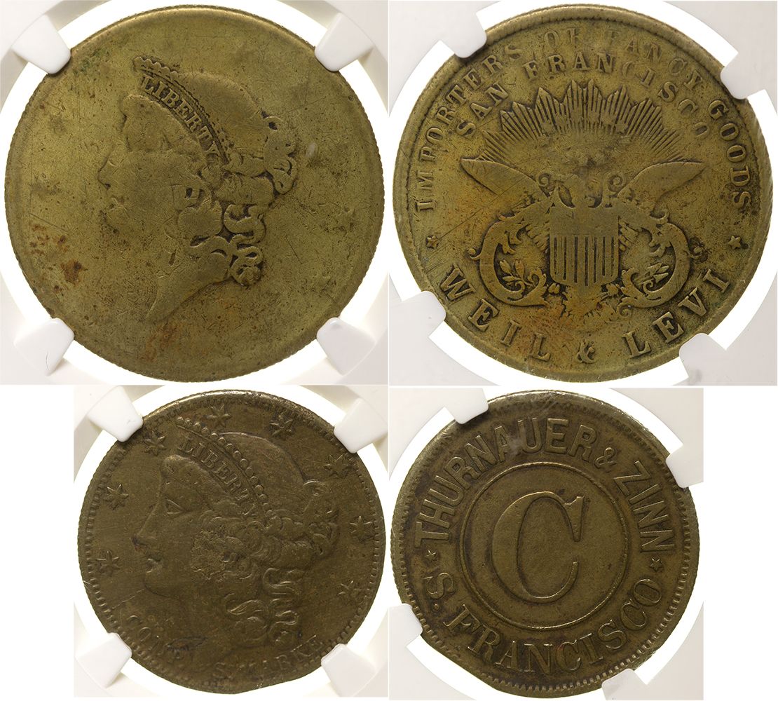 c1859 Two early Calif. game counter tokens, a $10 and a $20. - HKA#65870