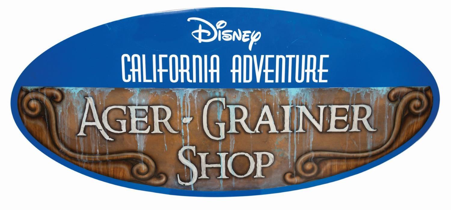 (California Adventure, c.2010s) A behind-the-scenes park used sign from Disney California Adventure. The large, enameled metal sign features the shop's name in an intentionally distressed panel made to appear as worn antique metal with oxidation and heavy patina. Ager/Grainers create artistic distress to age buildings, props, furniture, and other surfaces at the park. This sign would have hung over the entrance to the workshop where backstage personnel helped concoct the illusion for which the Disney parks are celebrated. Measuring 25.25"x55.25", the sign is in good condition, with some paint loss along the edges, surface scratches, and general wear from outdoor display.