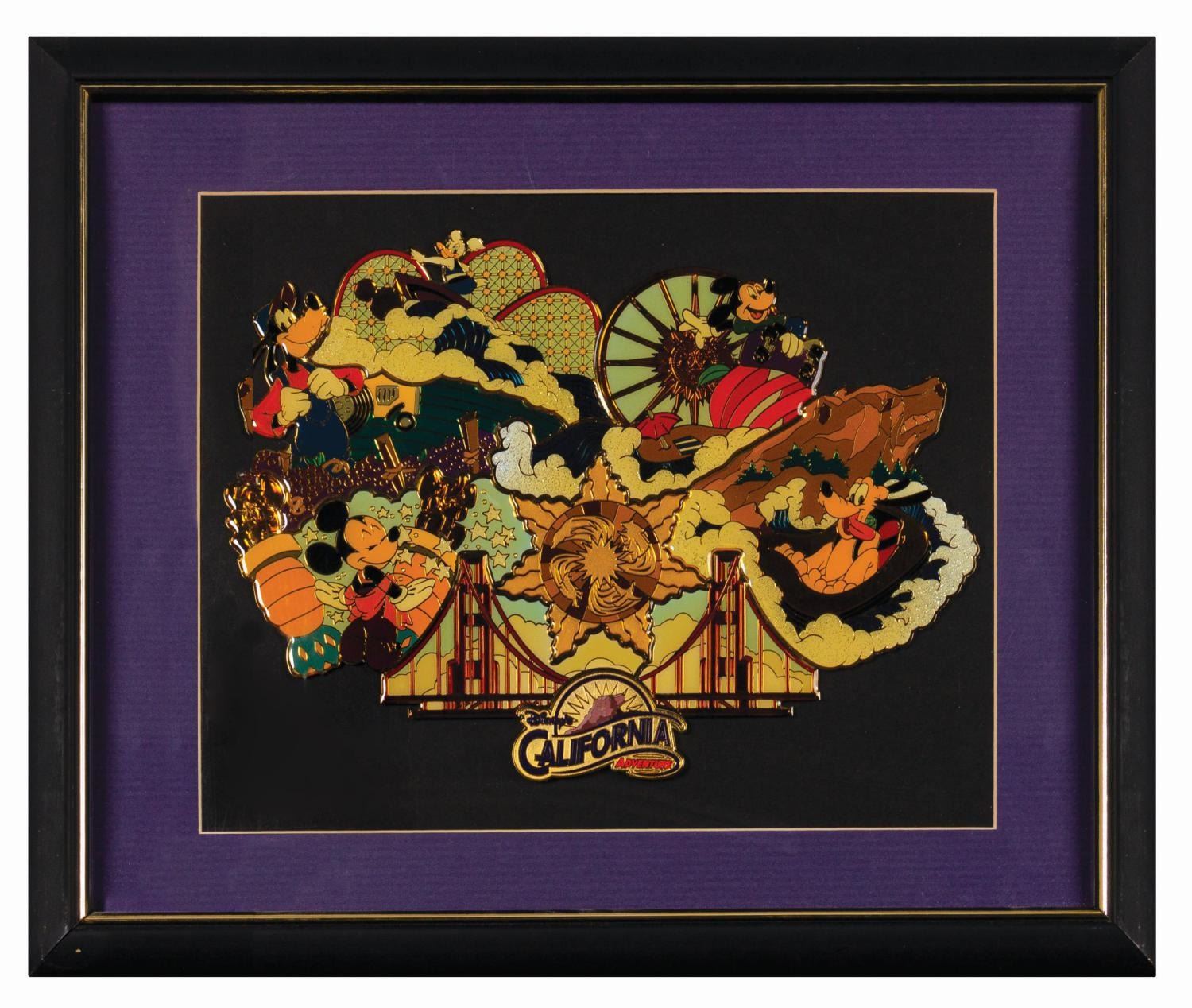 (California Adventure, 2001) A limited edition framed set of (9) Disney California Adventure enamel pins created for the park's grand opening. The oversized enamel pins interlock to form a collage featuring Disney characters in iconic landmarks from the park. The set is accompanied by a California Adventure COA with the edition number "111/900." Measuring a combined 8.5"x11.5" within a 14.25"x17.25" black wood frame, the pins are in very fine, as-new condition with some minor surface wear to the frame.