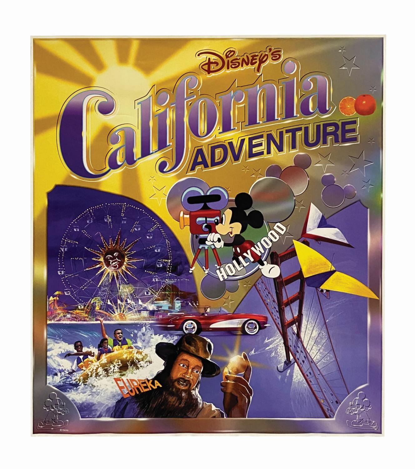 (California Adventure, 2001) A special Disney's California Adventure Poster created for the theme park's grand opening celebration. The poster juxtaposes new attractions like Soarin' Over California, the Sun Wheel, and Grizzly River Run with imagery from Disney and Golden State history, illustrating the conceptual inspiration for the park. Rolled and never folded, the poster measures 20.5"x27.5" and is in very good condition with scattered stress lines throughout.