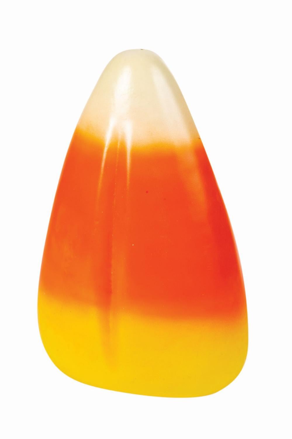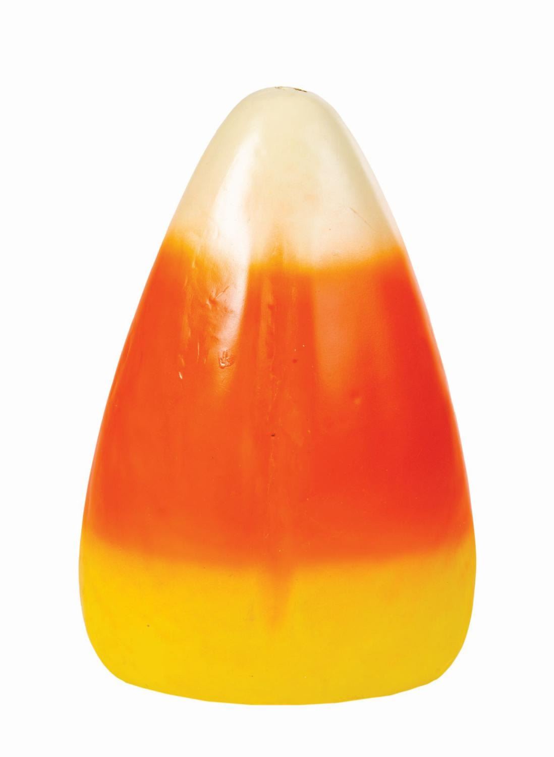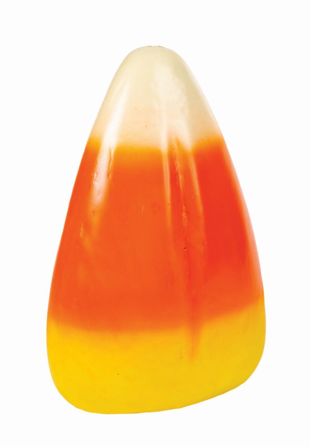 (California Adventure, c.2000s) An oversized candy corn prop from the seasonal Candy Corn Acres overlay of Sunshine Plaza at Disney's California Adventure. Large pieces of candy corn such as this are used in all manner of clever and comedic displays, such as agricultural scenes in which candy corn kernels spring forth from vines or stalks. A hook that previously protruded from the tip of the plastic prop has been pushed inside the body, and the word "China" is molded into the bottom edge. Measuring 12"x7.5" and 4.5" deep, the prop is in very good condition with some surface impressions, scratches, scuffs, and a tiny dent with attendant cracking.
