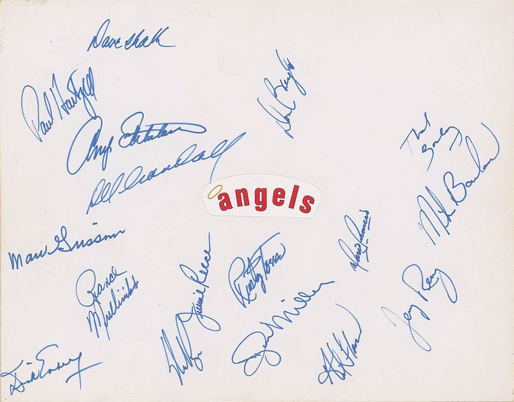 Seventeen felt tip signatures from a 1970s California Angels team on an off-white 14 x 11 cardstock sheet with an Angels logo affixed to the center. Signers include: Nolan Ryan, Don Baylor, Jerry Remy, Del Crandall, Paul Hartzell, Mike Barlow, Dyar Miller, and Rusty Torres. In fine condition, with light dings, toning, and soiling to the borders.