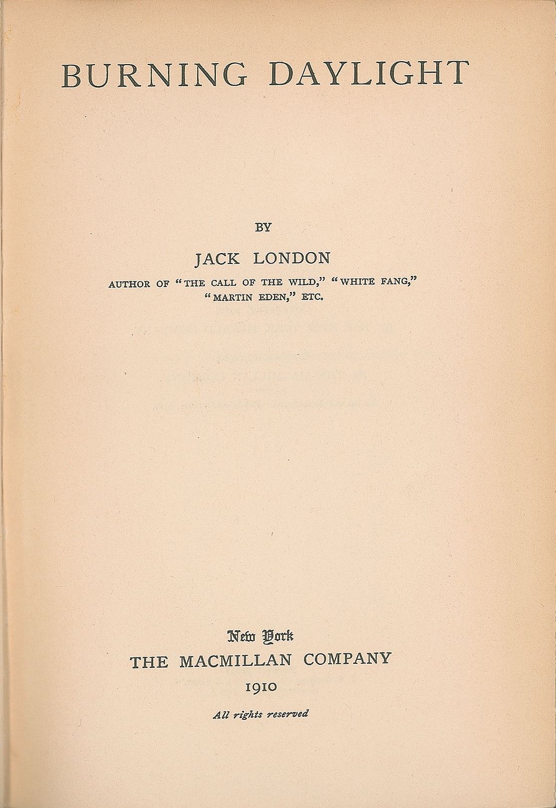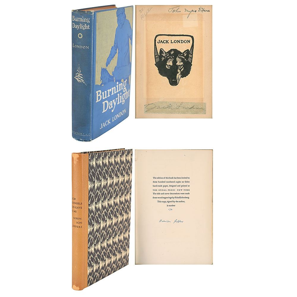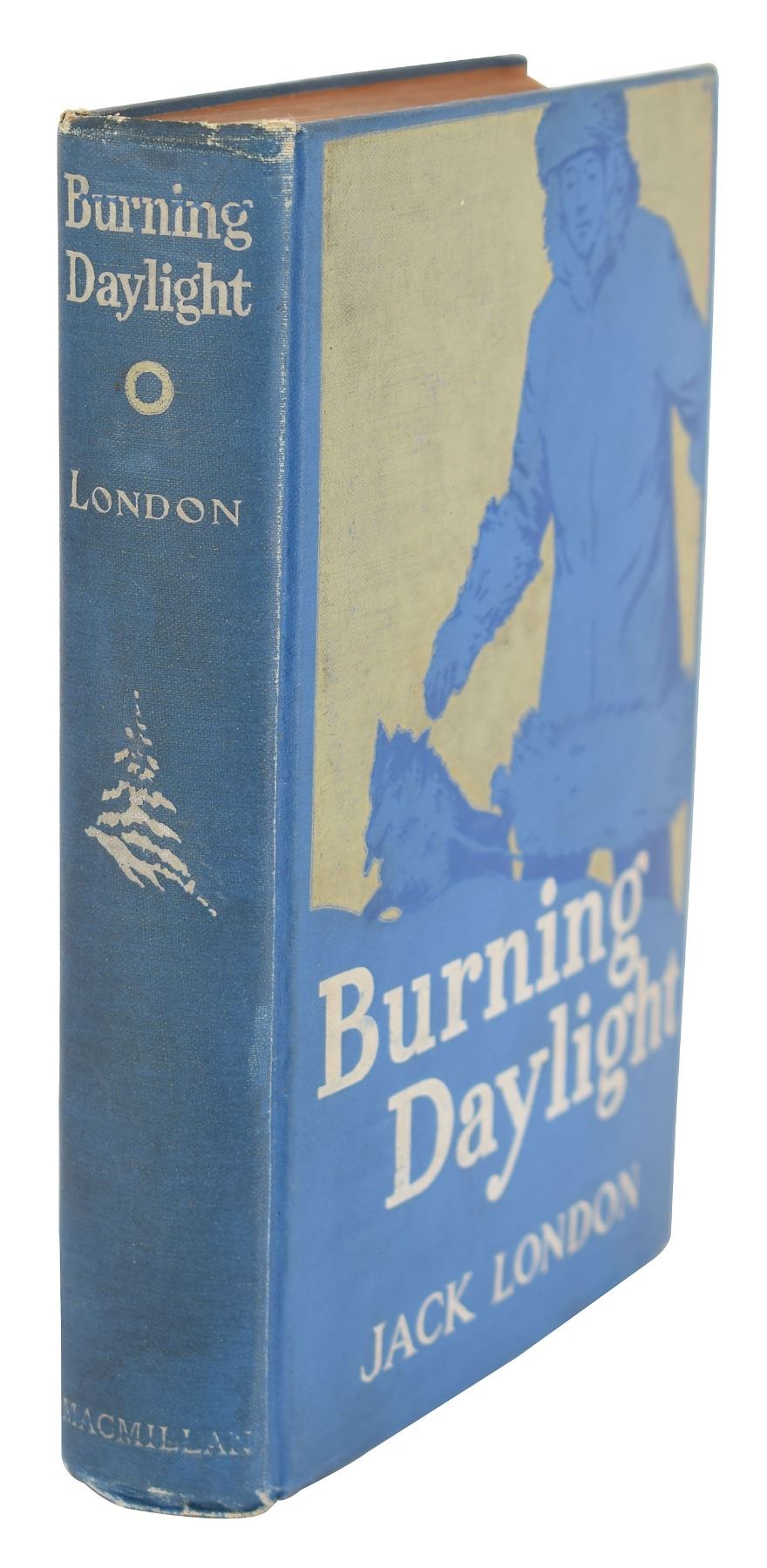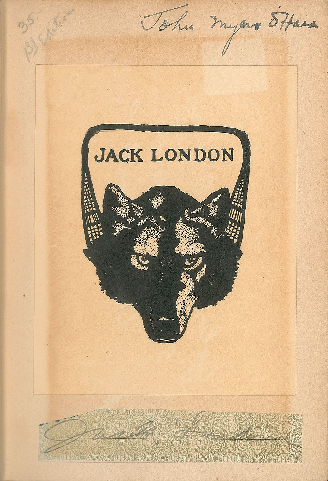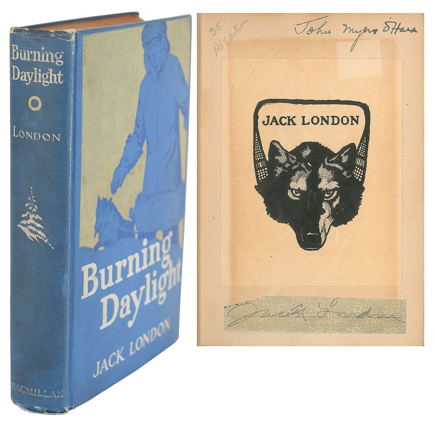 Signed book: Burning Daylight by Jack London. First edition. NY: Macmillan, 1910. Hardcover, 5.5 x 7.75, 361 pages. Signed on an off-white slip clipped from a check, "Jack London," affixed to the first free end page below one of his personal bookplates. The name of London's friend, the poet and translator John Myers O'Hara, appears to the upper right (perhaps his ownership signature). In very good to fine condition.