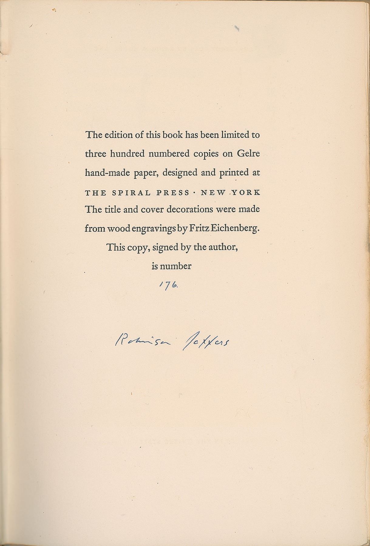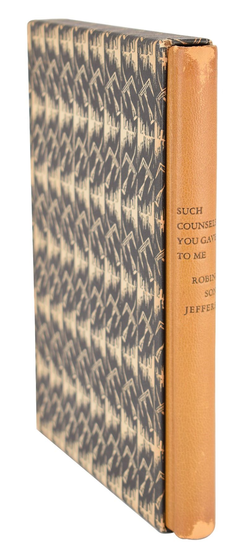 Signed book: Such Counsels as You Gave to Me & Other Poems by Robinson Jeffers. First edition, limited issue, numbered 176/300. NY: Random House, 1937. Hardcover with slipcase, 5.75 x 8.25, 129 pages. Signed on the colophon in fountain pen, "Robinson Jeffers." In fine condition, with rubbing at spine ends. A handsome volume with title and cover decorations made from wood engravings by Fritz Eichenberg.