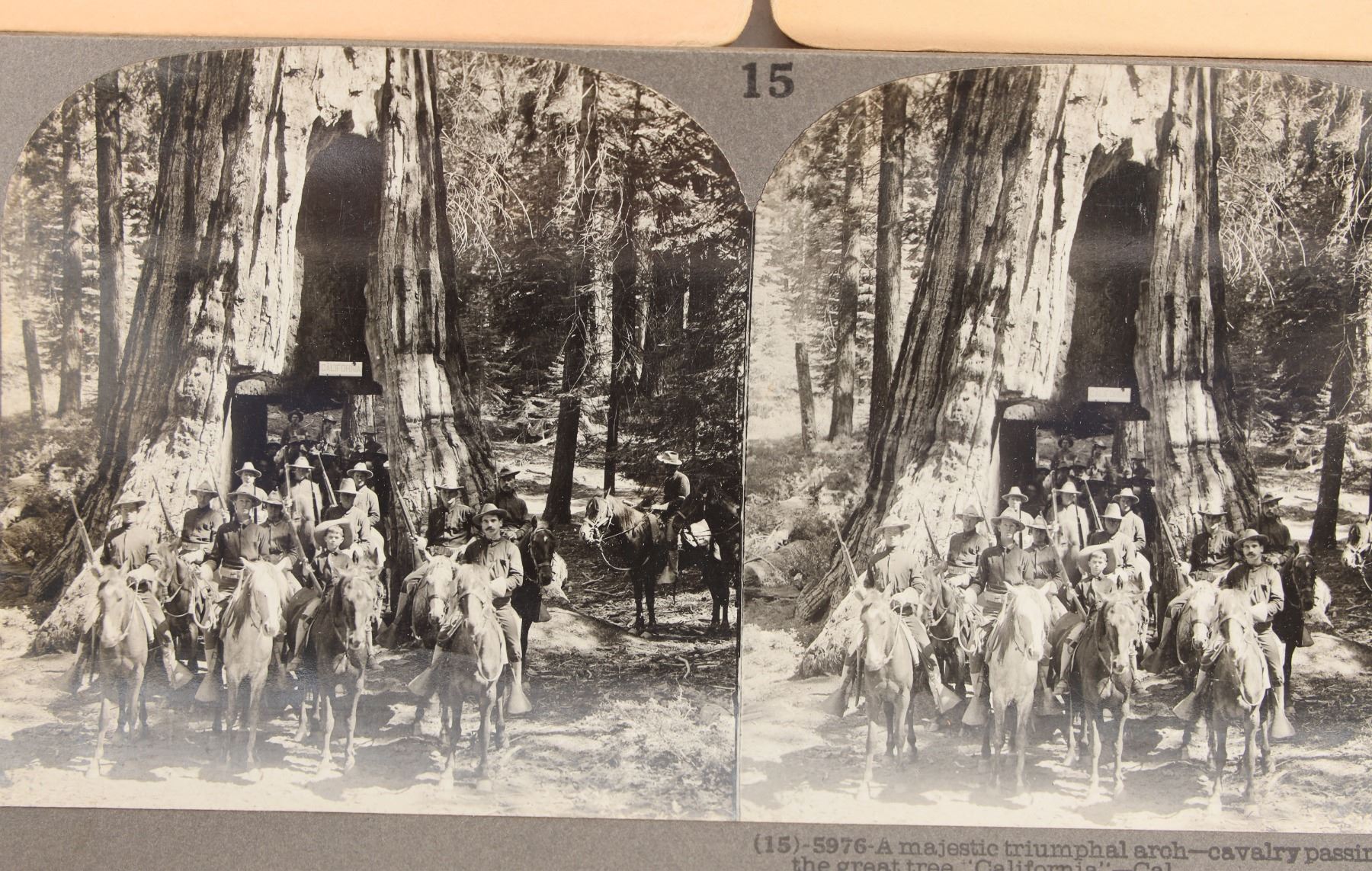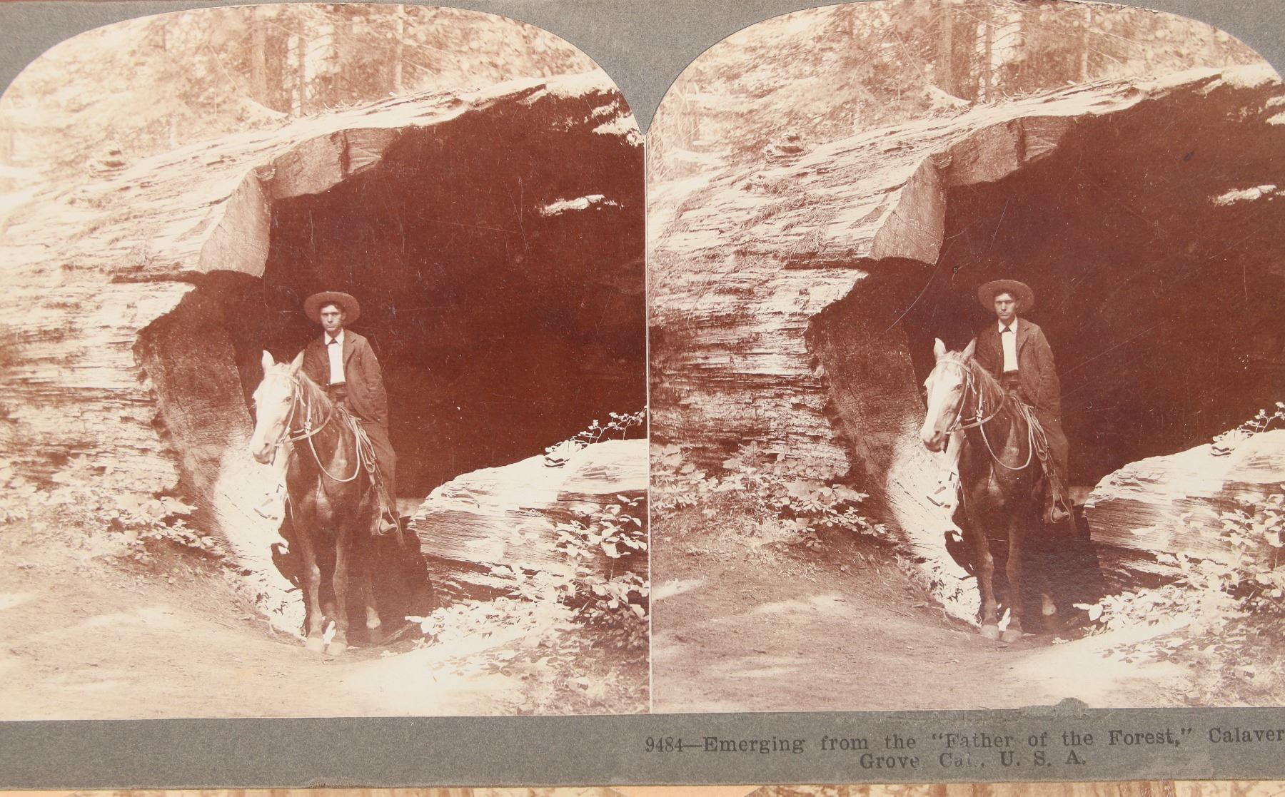 Lot of 11 different. Includes 4 by Watkins (1867-75), two by Keystone, Underwood & Underwood, Kilburn, and others. Views of stages going through the hollowed out sequoia (Great Tree in Mariposa Grove), Grizzly Giant, Guardian's Cabin, and more. The Mariposa Grove of Giant Sequoias, located in today's Yosemite National Park, was first brought to wider attention in 1857 when Galen Clark and Milton Mann documented its immense trees, including the Grizzly Giant and the Wawona Tunnel Tree. Recognizing its significance, President Abraham Lincoln in 1864 signed the Yosemite Grant, placing the grove and Yosemite Valley under state protection‚-the first U.S. federal act to preserve scenic natural areas. The grove later became part of Yosemite National Park in 1890, helping establish the model for modern American conservation.