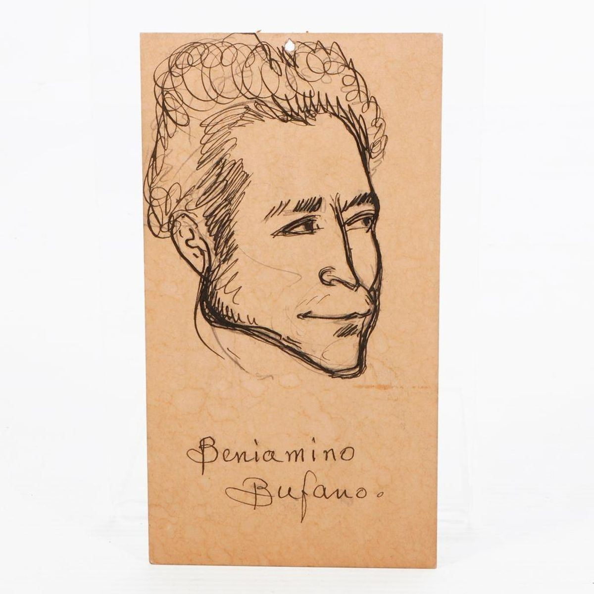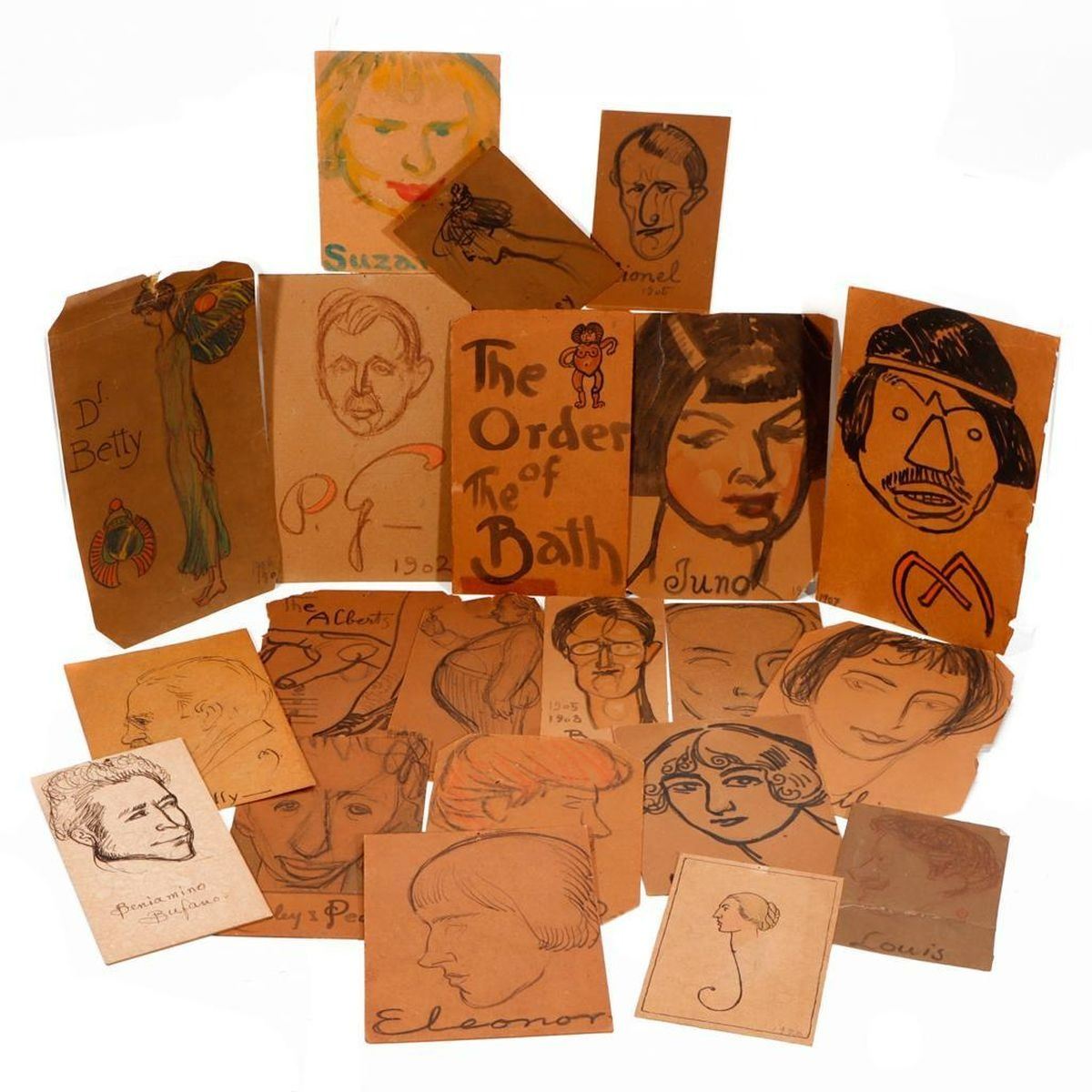 XAVIER MARTINEZ, 1869-1943; [BAY AREA BOHEMIAN CROWD]. A collection of twenty caricatures (including Martinez self-portrait, Beniamino Bufano, and Porter Garnett), that were saved together with a "title" card in Xavier Martinez's hand: "The Order of the Bath". It appears to have been a humorous "club" of friends from the San Francisco/East Bay/Carmel crowd, c. 1905-1923, where Xavier Martinez (and possibly others) drew character sketches of members. Most if not all appear to be in Martinez's style, and two are signed with his monogram, some dated. In charcoal/Conte crayon, watercolor, ink. Ranging in size from approx. 5in x 4 3/4in to 10in x 6in. Condition: Some spotting/staining, tears/losses, creases, at least one with tape repair. IDENTIFIED/POSSIBLE: 1.) "Beniamino Bufano" (1890-1970). 2.) "Isabel"; possibly Isabel Fraser, or Carmel friend Isabel Hunter? 3.) "Jean-o, 1916"; likely Gene Frances McComas, 1886-1982, journalist/artist and wife of artist Francis McComas. 4). "P.G. 1902": Porter Garnett (1871-1951), Bohemian Club member, writer (plays, The Lark), and assistant curator at the Bancroft Library. 5.) A self-caricature by Xavier Martinez, signed with monogram, 1907. 6.) "Tolmie"; Robert Tolmie, a pianist who lived in the Oakland Hills. TO BE IDENTIFIED: 7.) "The Alberts". 8.) "Billy"; signed with Martinez monogram; on Oakland Art Gallery invitation dated 1926. 9.) "Basket, 1905-1908". 10.) "Dr. Betty, 1906". 11.) "Charley & Pearl, 1916-1920". 12.) "Eleanor". 13.) "J". 14.) "Juno". 15.) "Looney"; In a 1913 journal of an Arizona trip (see Lot), Martinez refers to Looney as being part of his "harem" with wife Elsie Whitaker. 16.) "Lionel, 1905". 17.) "Louis". 18) "Paulina". 19.) "Rud". 20.) "Suzanne, July 9, 1921". From the Family of Xavier Martinez (1869-1943), Elsie Whitaker Martinez (1890-1984), and Micaela Martinez DuCasse (1913-1989).