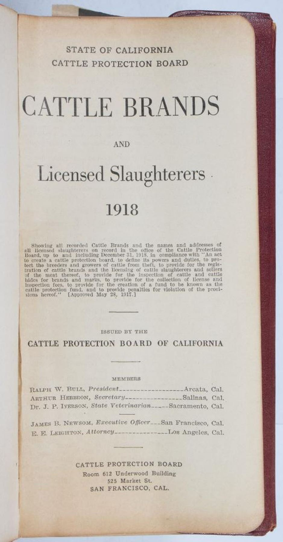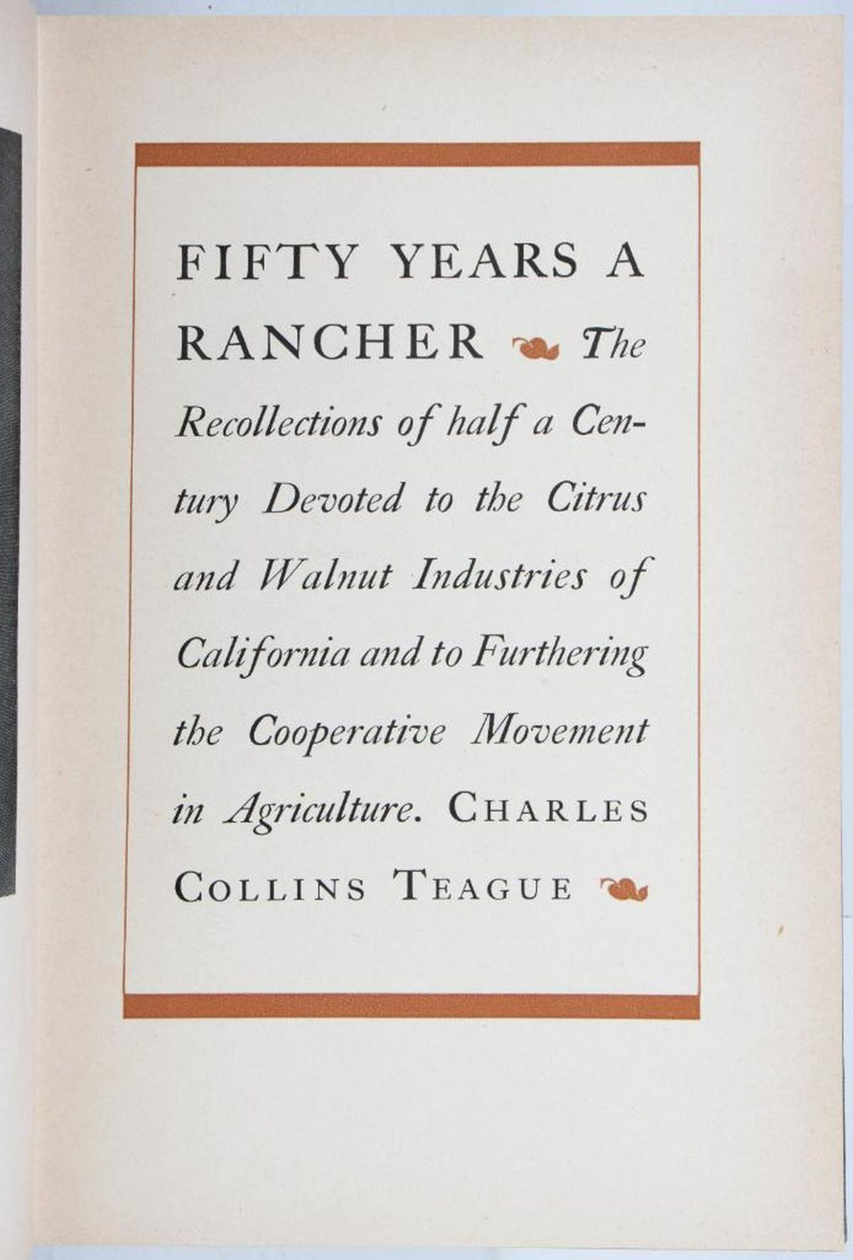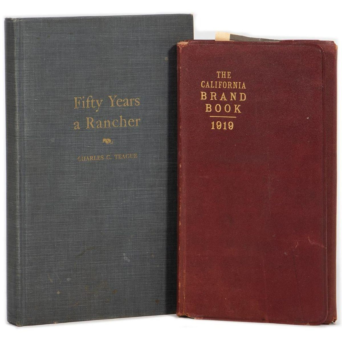 Two Books on California Ranching: 1. CATTLE BRANDS AND LICENSED SLAUGHTERERS, 1918. San Francisco: State of California Protection Board: [1918]. Red leather gilt-stamped 12mo with cover flap. Good; edgewear, losses top and bottom of spine and flap, small hinge split, tears bending to front pastedown. 2. TEAGUE, CHARLES C. Fifty Years a Rancher. Charles Collins Teague: 1944. Good; staining to cover, pages toned.