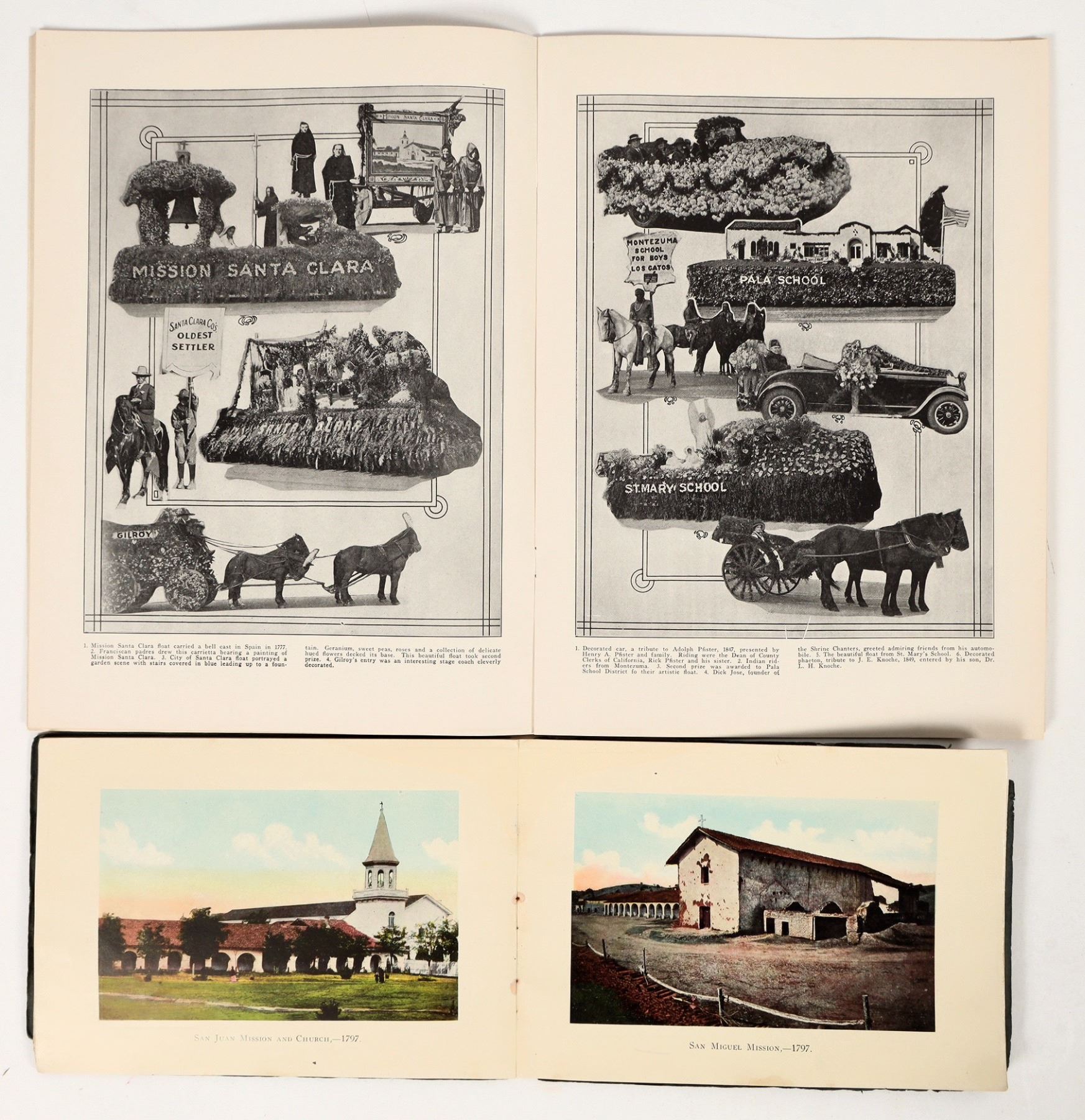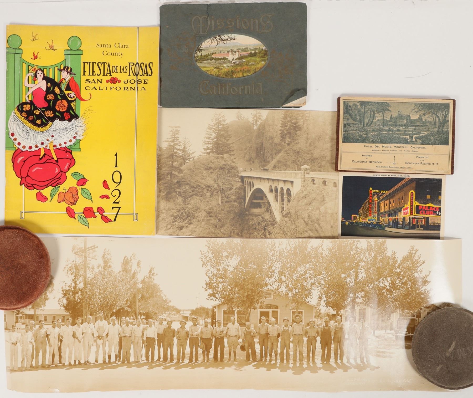 Group of California (and 2 other states) ephemera, including post cards from the Tahoe Biltmore Hotel, City of Reno street view, a 1914 color illustrated booklet of California Missions, unknown auto bridge photo, a panoramic photo of the Fuller Ranch Office and its personnel in Los Angeles, and a "Fiesta De Las Roses" souvenir magazine from Santa Clara 1927. There is a mounted post card of the Hotel Del Monte from Monterey, by the Southern Pacific RR. Very interesting and diverse group, please inspect.