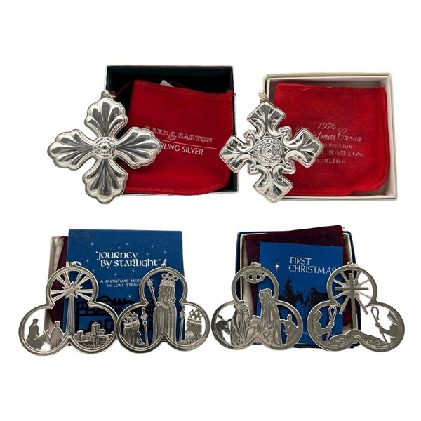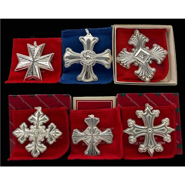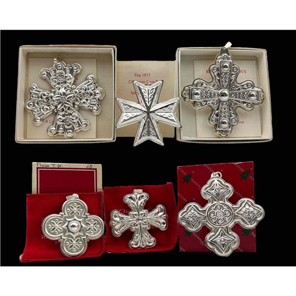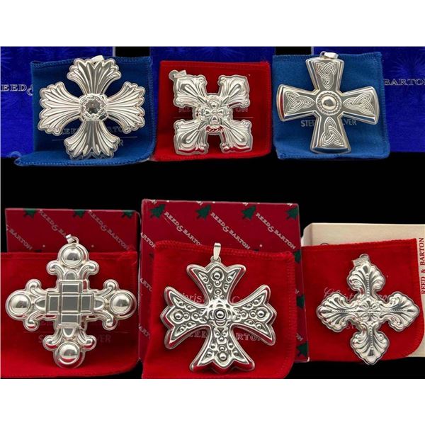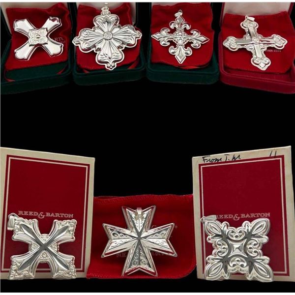 7 Sterling Silver Reed And Barton Christmas Cross Ornaments. 106.9g. Marked Sterling, Reed And Barton. Dated 1977, 1987, 1991, 2004, 2005, 2006, 2007.
