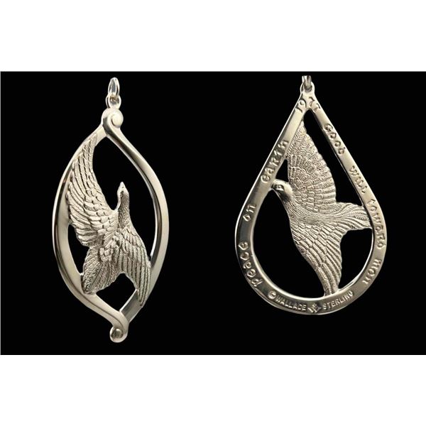 2 Sterling Silver Wallace Dove Pendants. 47.7g. Marked Sterling, Wallace. 1974 Peace On Earth Good Will Toward Men And 1977 Peace On Earth Good Will T