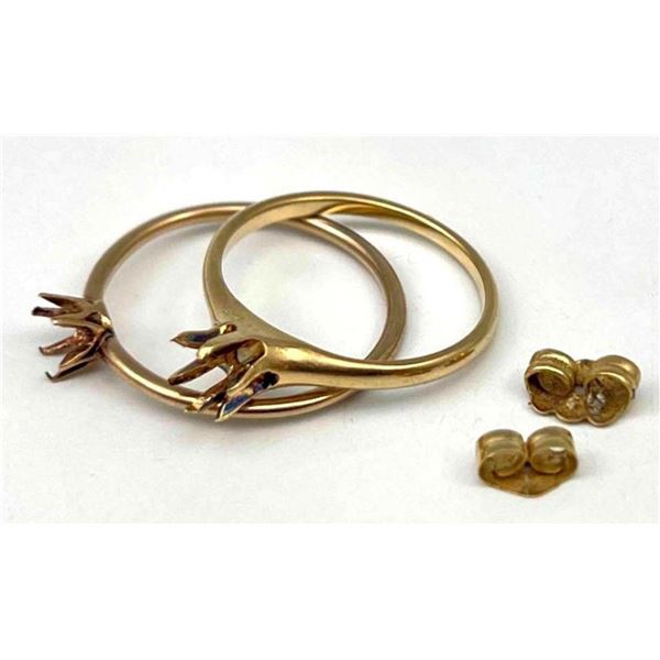14K And 10K Scrap Gold Lot. 14K 1.6g. 10K 0.9g. One Ring And Both Earring Backings Marked 14K. One Ring Unmarked, Tests As 10K. ALL CREDIT CARDS WILL