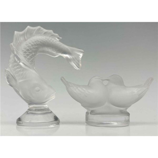 2 Hand Signed Lalique Crystal Figurines Of Jumping Fish And Kissing Doves. Marked Lalique France. Fish Approximately 3.5H x 2.5W x 1.25D in. Doves App
