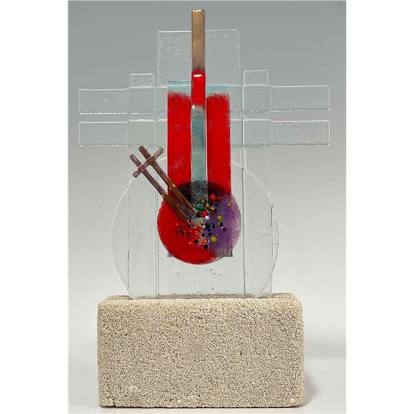Modernist or Post-Modernist Geometric Art Glass Sculpture On Stone Base. Unknown Artist. Approximately 14.625H x 12.0W x 2.0D in. Base Approximately 9