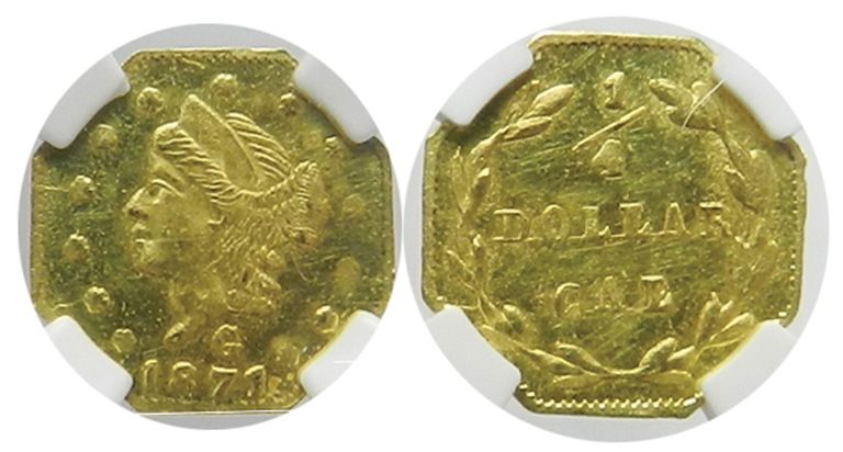 1871. Octagonal. BG-765. NGC MS64 and has nice Prooflike fields.