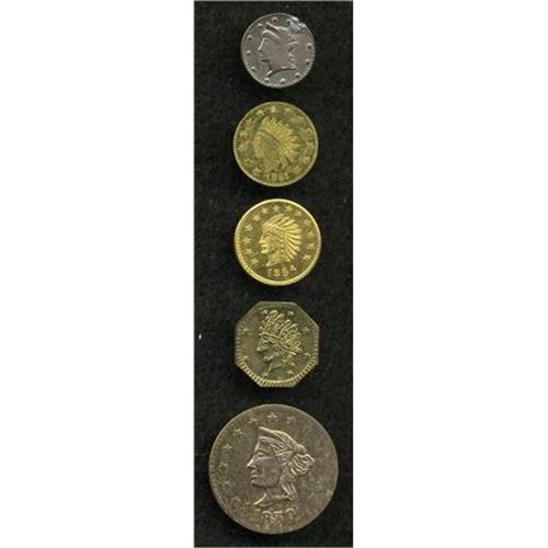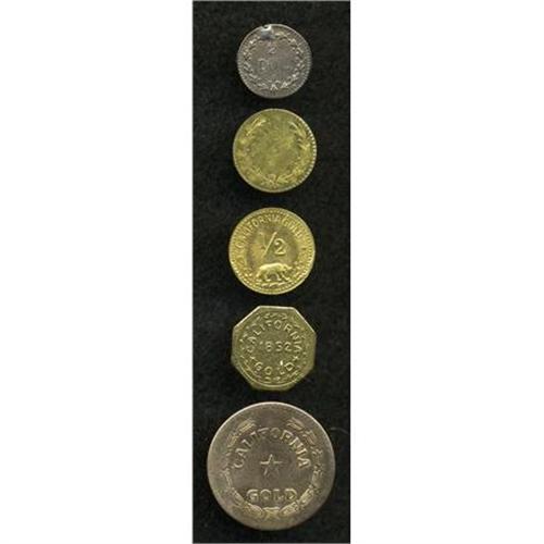 <B>California Gold Charms Group Lot.</B></I> Includes one very large piece about the size of a dime dated 1859 and four others dated 1854, 1852, 1881, and one undated. Due to the large-sized piece we recommend the viewing of this lot.<BR><BR><b>Shipping:</b> Coins & Currency (<a target="_blank" href="http://www.heritageauctions.com/common/shipping.php">view shipping information</a>)