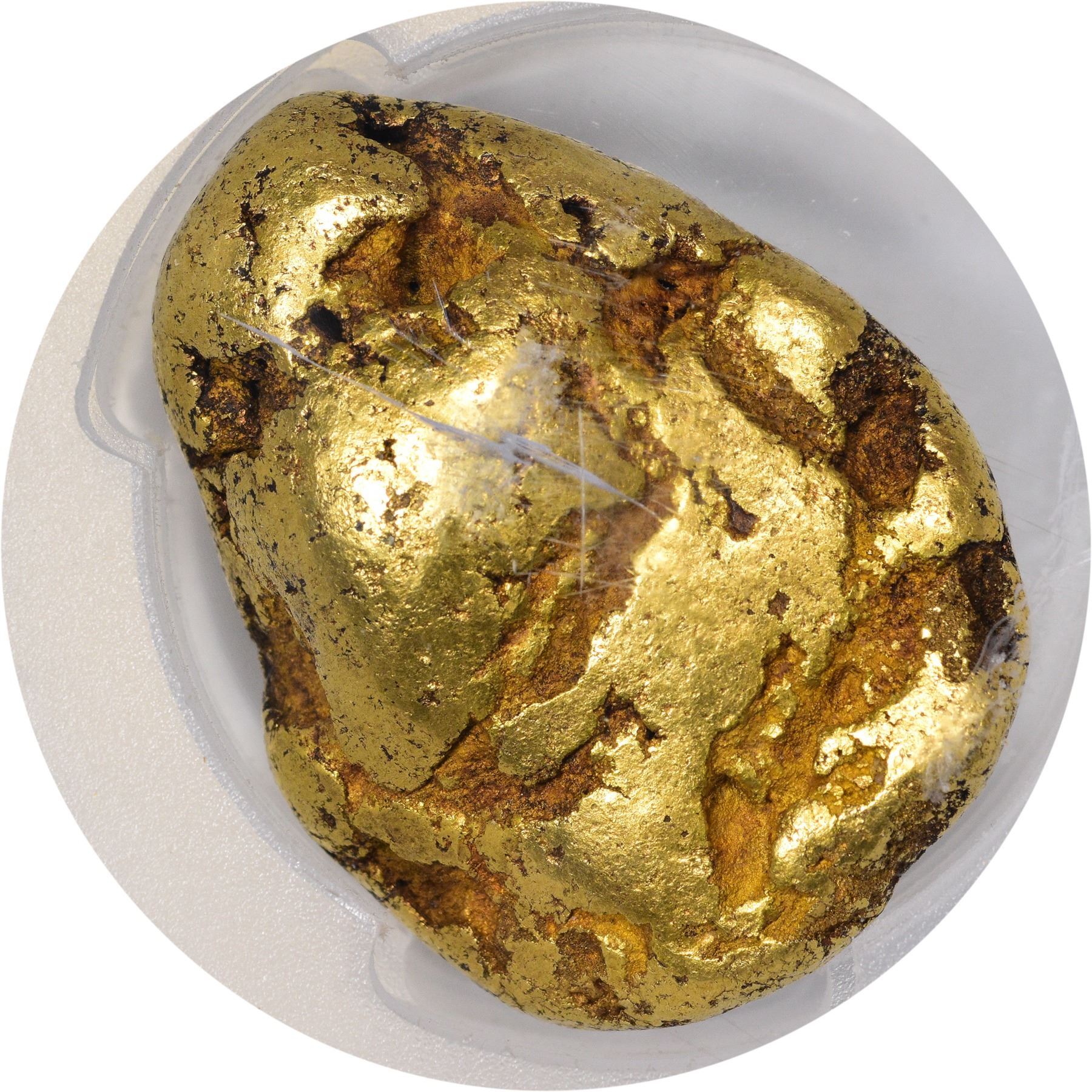 Description: This hefty hunk of California gold must certainly have excited the prospector who first laid eyes upon it. A bright yellow gold nugget with orange-gold highlights in the rough hollows that dart the surface. This mostly smooth ovoid nugget almost certainly had water running across it for eons before its discovery.
