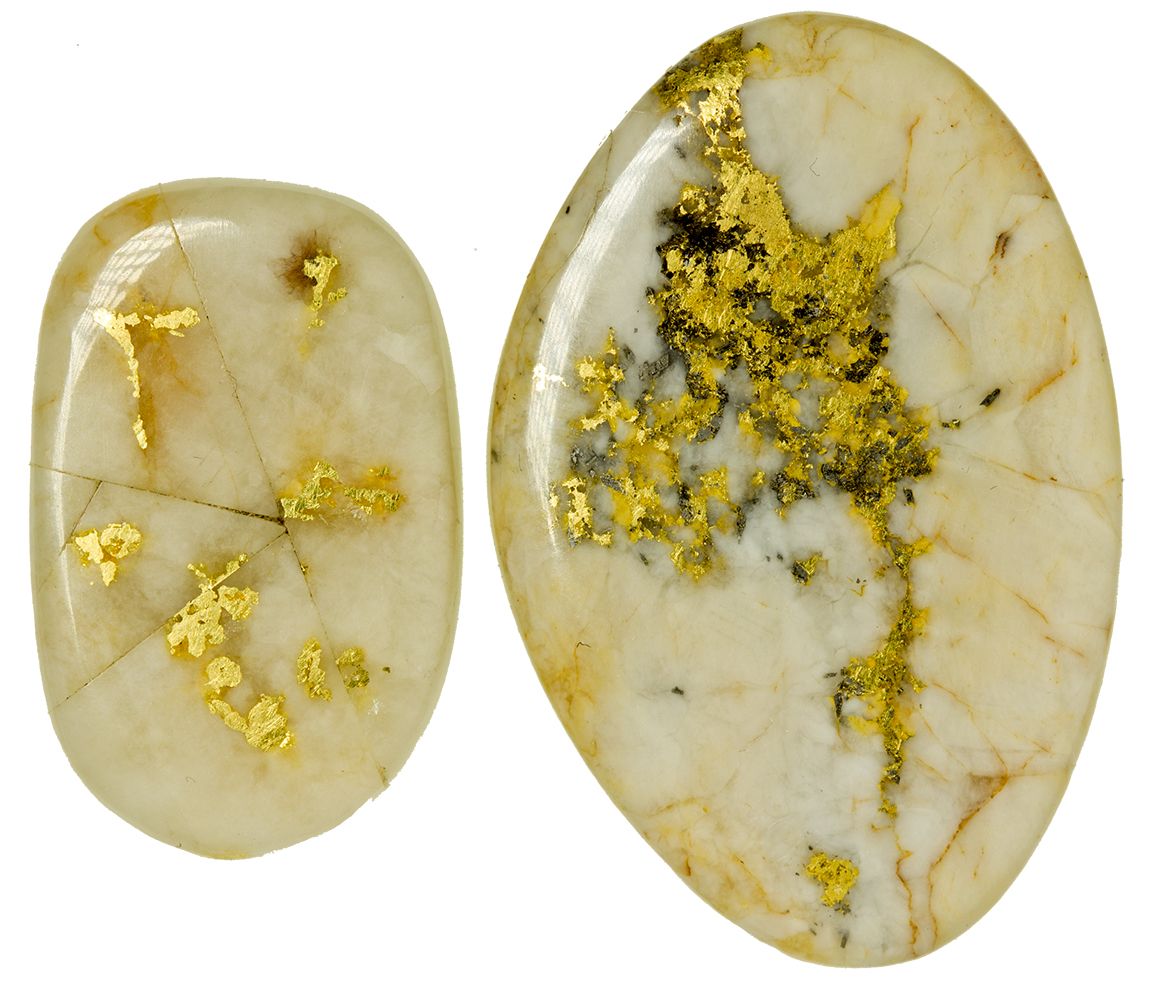 “This lot consists of two California gold quartz slabs. One measures 1” x .5”, the other 1.5” x .75”. The total combined weight of both pieces is .40 troy oz. Both are beautiful would be perfect for mounting in a nice jewelry setting.” - HKA#65942