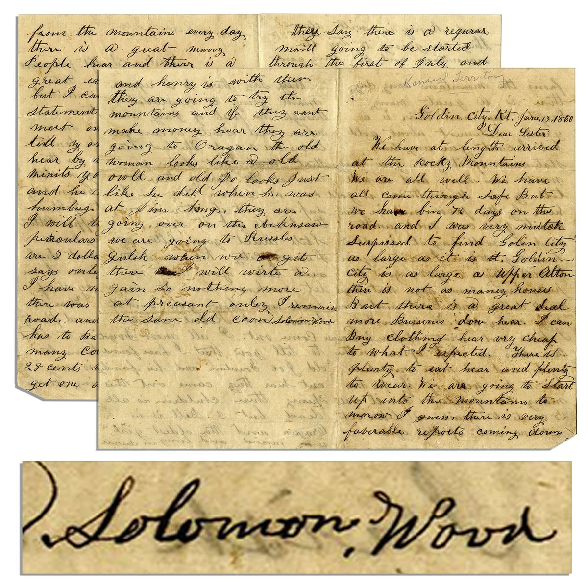 Autographed letter signed by a gold miner in the California Gold Rush. Letter was sent from Goldin City, Kansas Territory, dated 13 June 1860 and reads in full, ''Dear Sister, We have at length arrived at the Rocky Mountains. We are all well. We have all come through safe. But we have bin 79 days on the road. and I was very mutch surprised to find Goldin City as large as it is. Goldin City is as large as Upper Alton there is not as many houses but there is a great deal more Business done hear. I can buy clothing hear very cheap to what I expected. There is plenty to eat hear and plenty to wear. We are going to Start up into the mountains to morow I guess. there is very faverable reports coming down from the mountains every day. There is a great many people hear and there is a great excitement about gold. But I can't give any true statement of it yet. You may meet one man and he will tell you that there is gold hear by the peck and in five minits you can meet another and he will say it is all a humbug. When I write again I will try to give you the particulars. Some say that wages are 3 dollars and bord and some says only 1.50. The reason why I have not wrote before is because there was not pos offices on the road and a man out hear has to be well of if he has many correspondents. For it costs 28 cents to mail a letter or to get one out of the office. They say there is a regular maill going to be started the first of July and when that starts we can get letters for 3 cents. The last letter that I got from you was at Ft. Karney, There is one at Denver for me I spose and if there is one ther I will get it soon. Still direct your letters to Denver City KT and the next letter you write me let me know how the crops look and how you and the Irish and Robert Smith come out. I all most forgot to tell you that I have found old Joe Fountain and his family out hear they come out this sprig there children is all dead but 3. Bill is in Oragon and the oldest girl is married an living in Missouri and Henry is with them. They are going to try the mountains can't make money hear they are going to Oragon. The old woman looks like a old owll and old Jo looks just like he did at Jim King's. They are going over on the Arkansas. We are going to Russles Gulsh when we get there I will write again so nothing more at preasant onley I remain the same old coon. Solomon Wood.'' 4pp. letter on a single sheet of card-style stationery measures 5'' x 8''. Expected toning and creasing, pinhole separation to fold intersections and an ink notation ''Kansas Territory'' at the top edge, else near fine.
