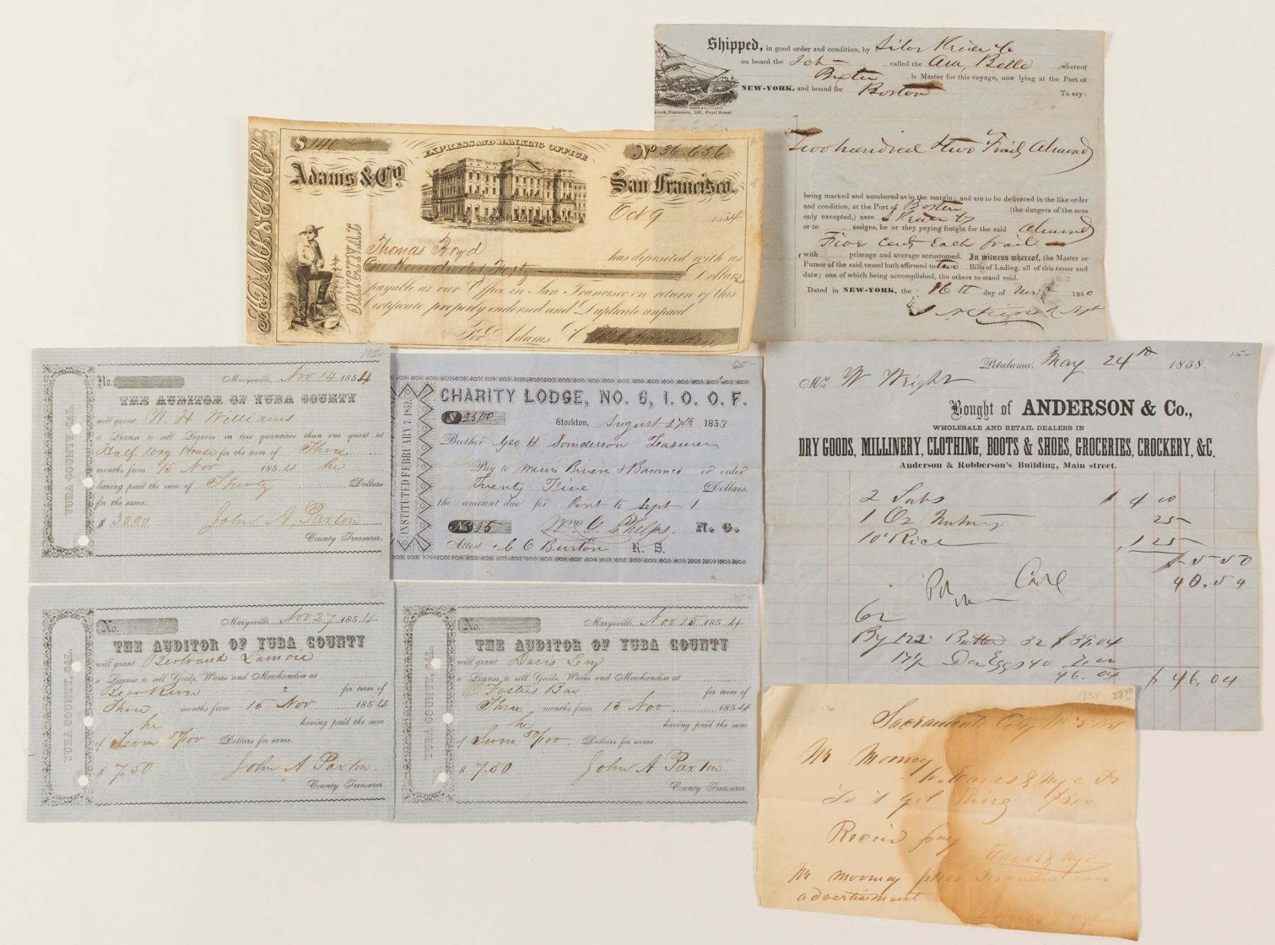 1851 Sacrament receipt with large stain. 3 1854 Auditor of Marysville Yuba County license receipts.1853 Charity Lodge check. 1858 Anderson and Co.Petaluma 1850 pictorial shipping receipt. billhead. 1854 Adams and Co. San Francisco 1854 bank deposit receipt. City: State: California Date: