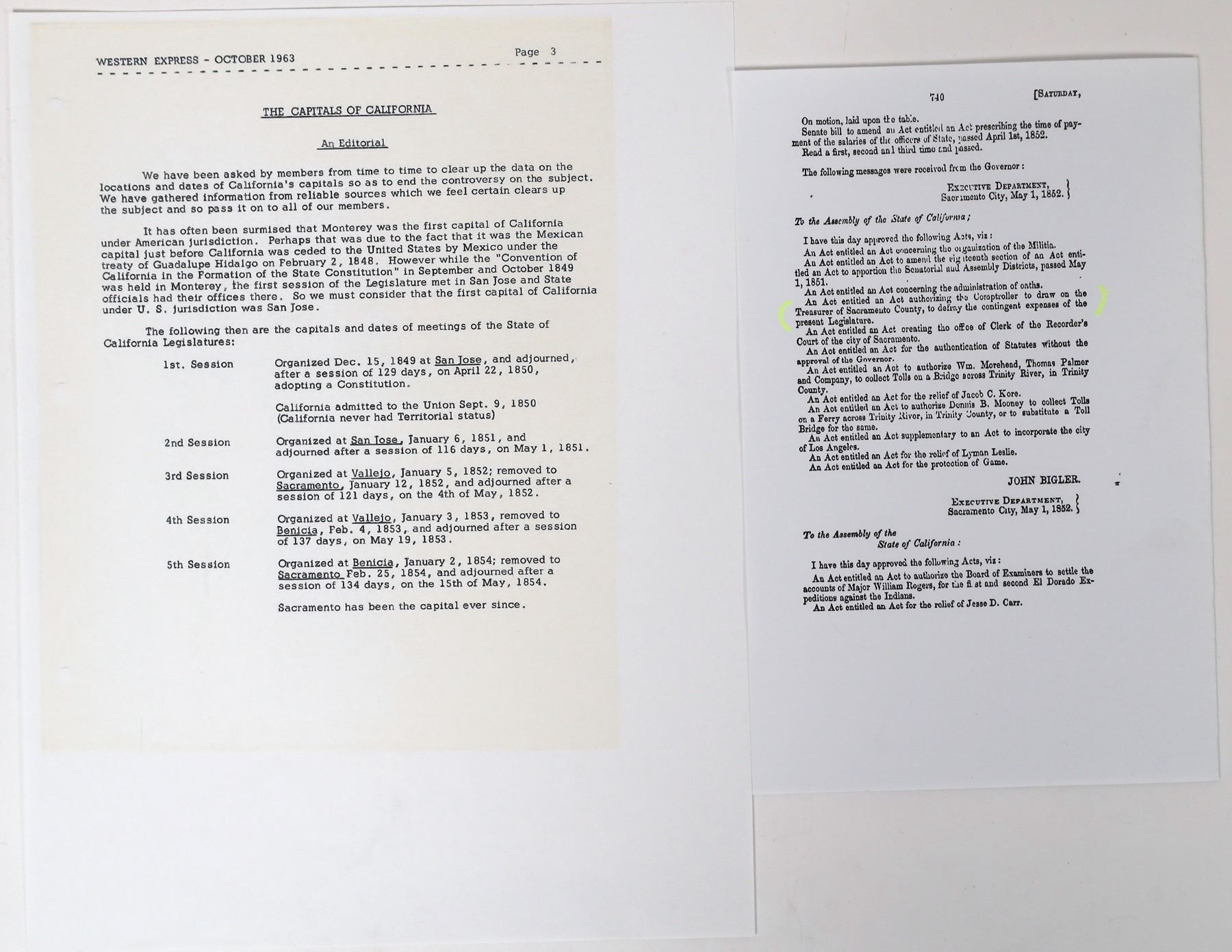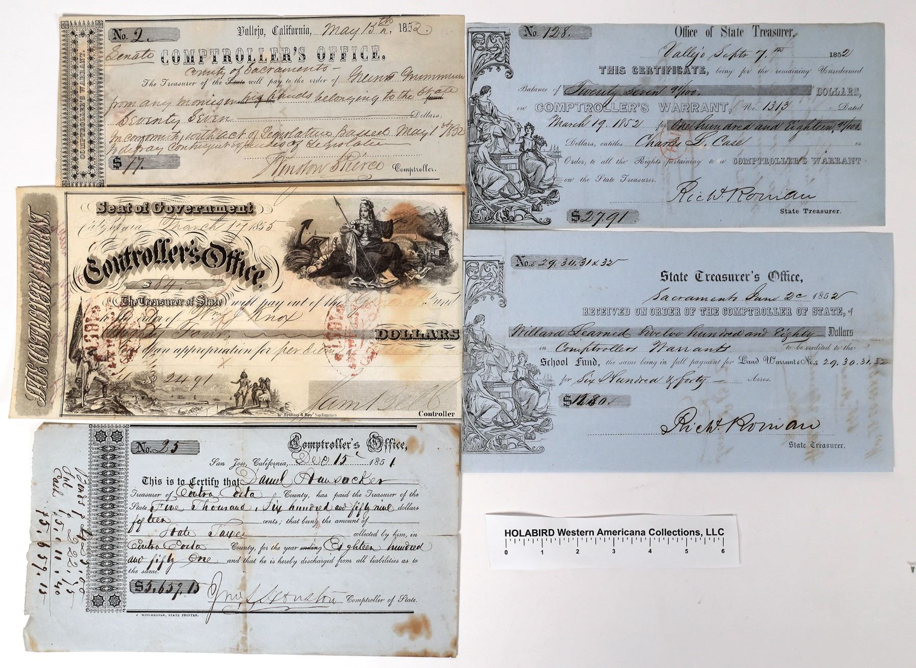 Lot of 5. These warrants tell the story of how the California state capital location was in flux during the Gold Rush. The meetings of the State Legislature set the location and were as follows: 1st Session, San Jose (Dec. 15th, 1849); 2nd Session, San Jose (Jan. 6th, 1851); 3rd Session, Vallejo (Jan. 5th, 1852) to Sacramento (Jan. 12, 1852); 4th Session, Vallejo (Jan. 3, 1853) to Benicia (Feb. 4, 1853); and 5th Session, Benicia (Jan. 2, 1854) to Sacramento (Feb. 25, 1854). Sacramento became the capital for that moment on. 1) Comptroller's Office warrant, San Jose, Dec. 15th, 1851. To the treasurer of Contra Costa County for $5,659.15. Signed by John Houston. 2) State Treasurer's Office warrant, Sacramento, Jan. 2, 1852. Issued to William Learned for $1,280. Signed by treasurer Rich. Roman. 3) State Treasurer warrant, Vallejo, Sept. 7th, 1852. Issued to Charles L. Case for $27.91. Signed by treasurer Rich. Roman. 4) Comptroller's Office warrant, Vallejo, May 13th, 1852. To the County of Sacramento, related to an Act passed in the Assembly, 1852. Signed by Comptroller Winston Pierce. 5) Controller's Office warrant. 1855. To William Knox for $84. Signed by Sam Bell, controller. Sacramento. California 1851-55