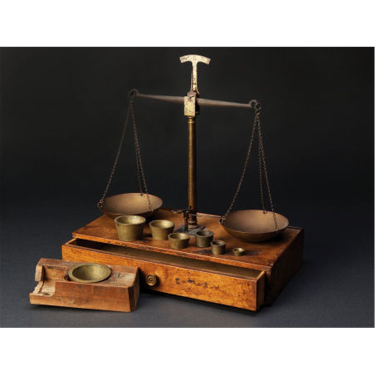 California Gold Rush Table-Top Set of Gold Scales by Tradition from the Trading Post at Washington Flat, California. The table top set of gold assayer's scales, comprising an adjustable brass balance beam scale mounted on a wooden base with single drawer containing a wood block rack containing seven different brass counterweight bowls ranging in weight from 1/4 oz. to 1 lb. One brass balance tray and weights marked: C.C.S./1859. Wooden block marked: Charpenter/A Paris [with crown proof above].By tradition, this item by was purchased by a Dr. G. P. Cooper at Angels Camp, California in 1915 from the Richards/Forsyth family. Condition: Very good. Showing period age wear and patina. Left side panel of wooden base missing. Period staining to wooden base.