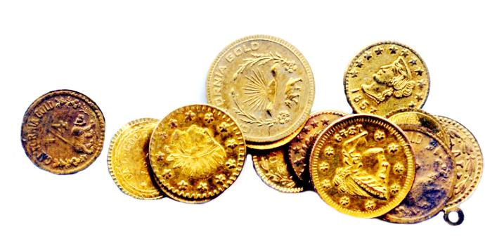 California Gold tokens and charms. Round. Lot of twelve (12) assorted types, dates pr undated. Mostly modern gold-plated replicas. An interesting group with ties to the California gold rush. Average grade of EF. One additional type attributed to Columbia. Total of thirteen (13) pieces.