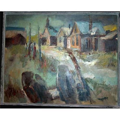 California Impressionism, Artist A. LINESCH, 1950's<p>Title: Unknown. Resembles early Salinas area<p>Artist: A. Linesch<p>Age: Estimate 1950's<p>Medium: Oil on art canvas board<p>Size: Artwork measures 16 " x 20"<p>Frame: Wood frame with rustic, weathered finish measures 24" x 28". Frame is entirely complimentary to the artwork.<p>Condition: Artwork and frame in extremely good condition, ready for display.<p>Signature: Signed Lower Left Corner.<p>Notes: The photographs of this painting do not do it justice. It is a marvelous example of California Impressionism, circa 1950's, with muted greens, blues, and russet tones. It appears to us to be the Salinas area, with rustic buildings and church, and farm implement in the foreground. The label on the verso gives us some information on the artwork. He was a professional artist who lived in the Los Angeles area in the 1950's, as evidenced by the lack of zip code in the address.<p>Please Note: Item is covered by our 30 day Refund Policy.