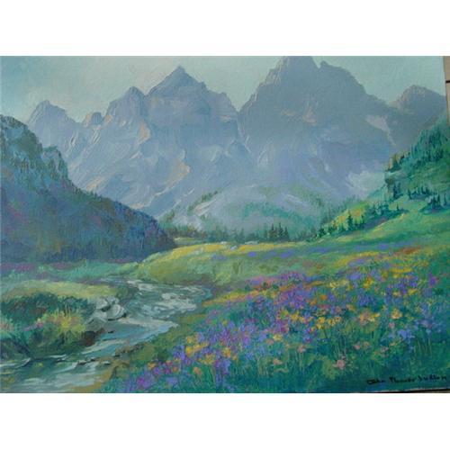 Up for sale is this original, signed, John Plumer Ludlum oil painting of a Sierra Mountain view in California, titled "Mountain Meadow" and dated 4/83.