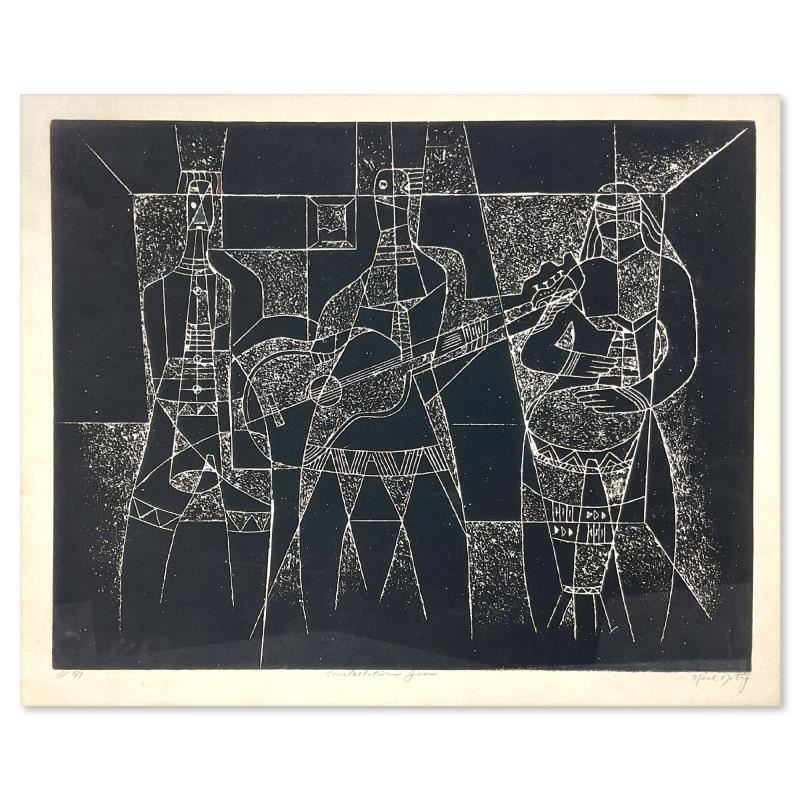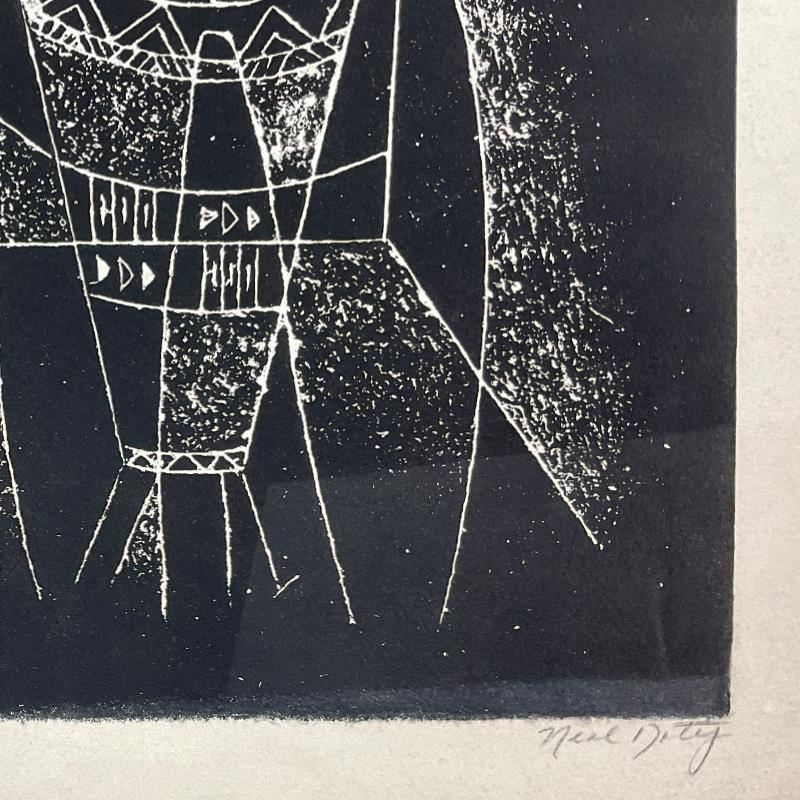 California Jam by Neal Doty (1941-2016). Please see photos and description for all available information. "California Jam" is a limited edition linocut on paper by Neal Doty (1941-2016), AP numbered 5/7 and hand signed by the artist. Includes Letter of Authenticity. Measures approx. 23" x 18.5" (border), 20" x 15.5" (image). ** Please note: there are imperfections in the border area; discoloration and smudging and stains. **