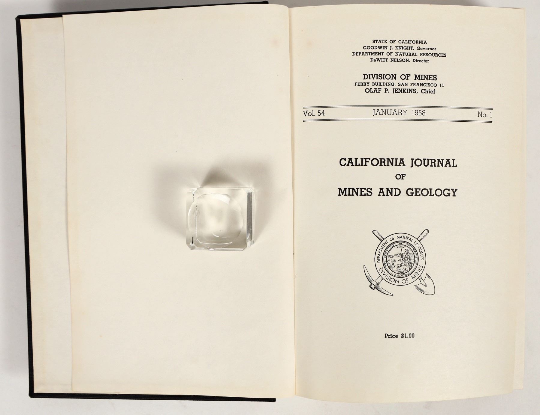 Fred notes that this is a key reference as mining was down in this time period due to inflation and the cap on gold and silver. Much was done for the benefit of the strategic minerals programs post World War II and Korean War. Cover various counties in California. 602pp. and 4 plates/maps. 9.25 x 6.25" A very nice clean copy.